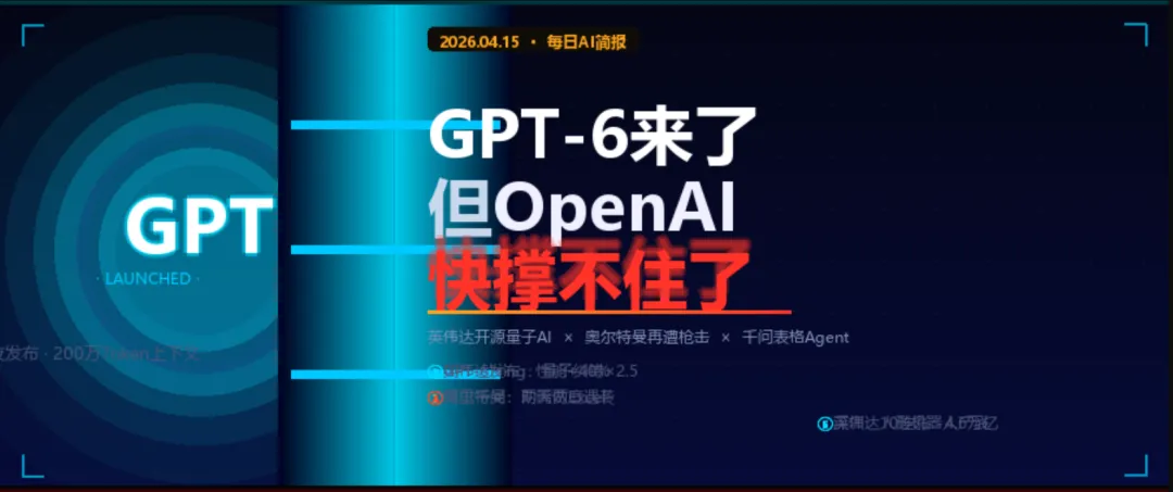 📌 事件:OpenAI于4月14日晚正式发布GPT-6(代号"Spud/土豆"),综合性能较GPT-5.4提升约40%,200万Token上下文窗口,逻辑推理进入人类前1%,原生世界模型具备物理引擎能力。但同日,媒体揭露OpenAI一周内6名核心高管离职,CEO奥特曼与CFO公开内讧(上市分歧),《纽约客》发布百名内部人士证词指控奥特曼操纵权力与道德缺失。