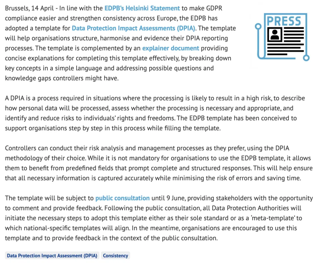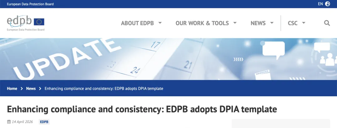 EDPB发布DPIA模板征求意见稿2026年4月14日,欧洲数据保护委员会(EDPB)发布并采用数据保护影响评估(DPIA)模板,旨在落实赫尔辛基声明,提升GDPR合规效率并强化欧洲范围内的一致性。该模板配套解释性文件,以通俗语言拆解关键概念,帮助组织规范开展DPIA流程,在涉及高风险数据处理时更好地描述处理方式、评估必要性与适当性,并识别和降低对个人权利的风险。虽然模板并非强制使用,但其预设字段有助于确保信息完整、结构清晰,从而减少错误并节省时间。模板将于6月9日前公开征求意见,后续各成员国数据保护机构将推进其作为统一标准或协调“元模板”落地,同时鼓励组织积极试用并反馈意见,以进一步提升DPIA实践的一致性与可操作性。导读系本公众号原创,转载请注明文字出自本公众号。