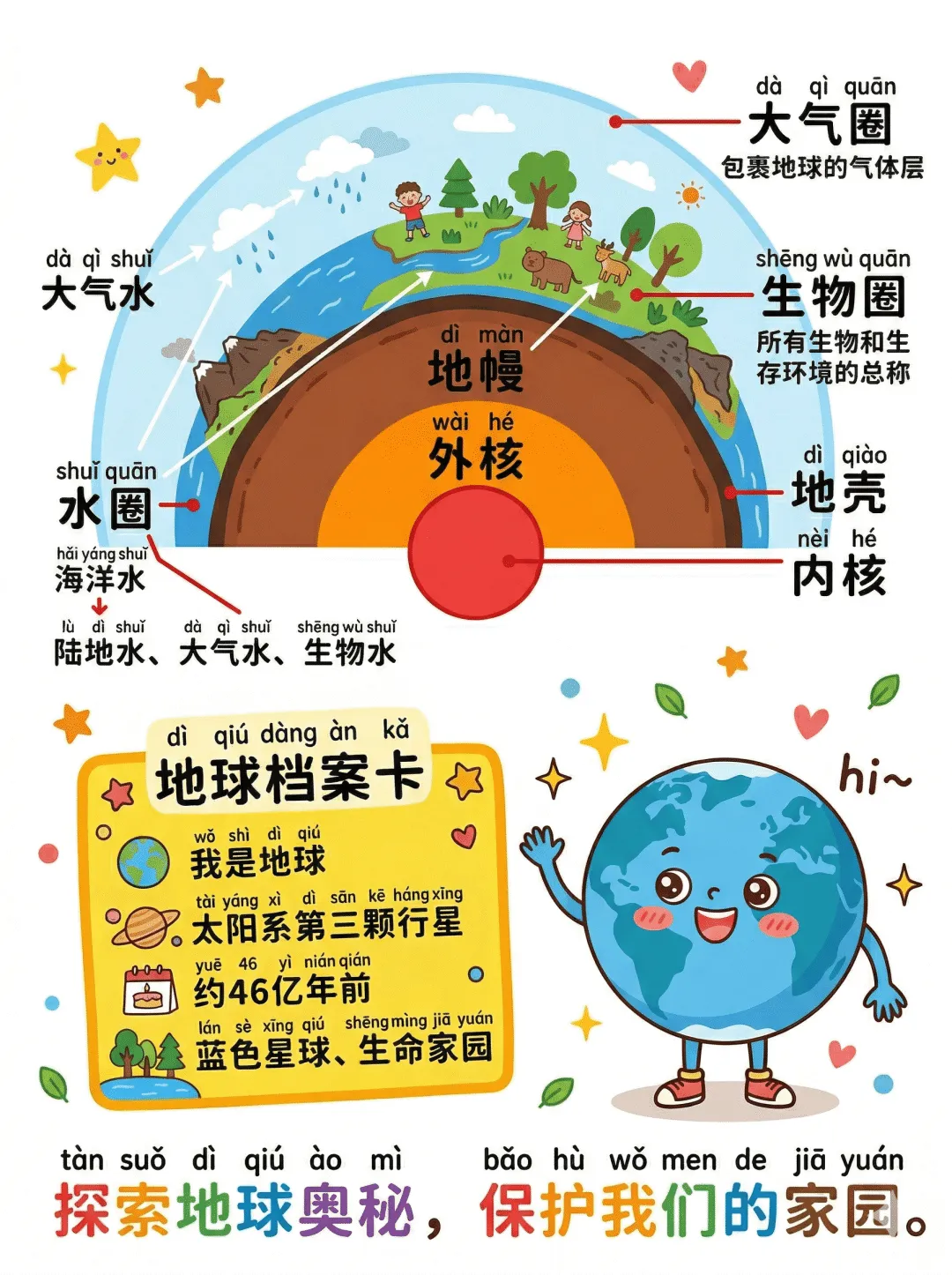 💡 1. 揭秘地球内部,建立基础认知 用像切西瓜一样的生动剖面图,带孩子认识地壳、地幔、外核、内核,以及大气圈、水圈和生物圈。还有超可爱的“地球档案卡”,让孩子知道我们的地球妈妈已经大约45亿岁啦,特长是孕育各种动植物!