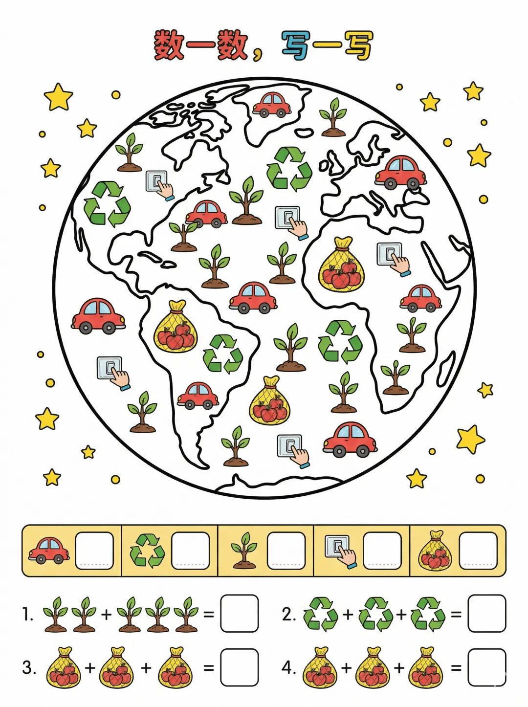 🖐️ 4.结合环保的趣味数学启蒙 最后还有一张“数一数,写一写”大闯关!让孩子在地球轮廓里找出对应的环保小图标(如小树苗、回收标志、电动车等),不仅锻炼专注力和观察力,还能顺便做个简单的加法启蒙练习!