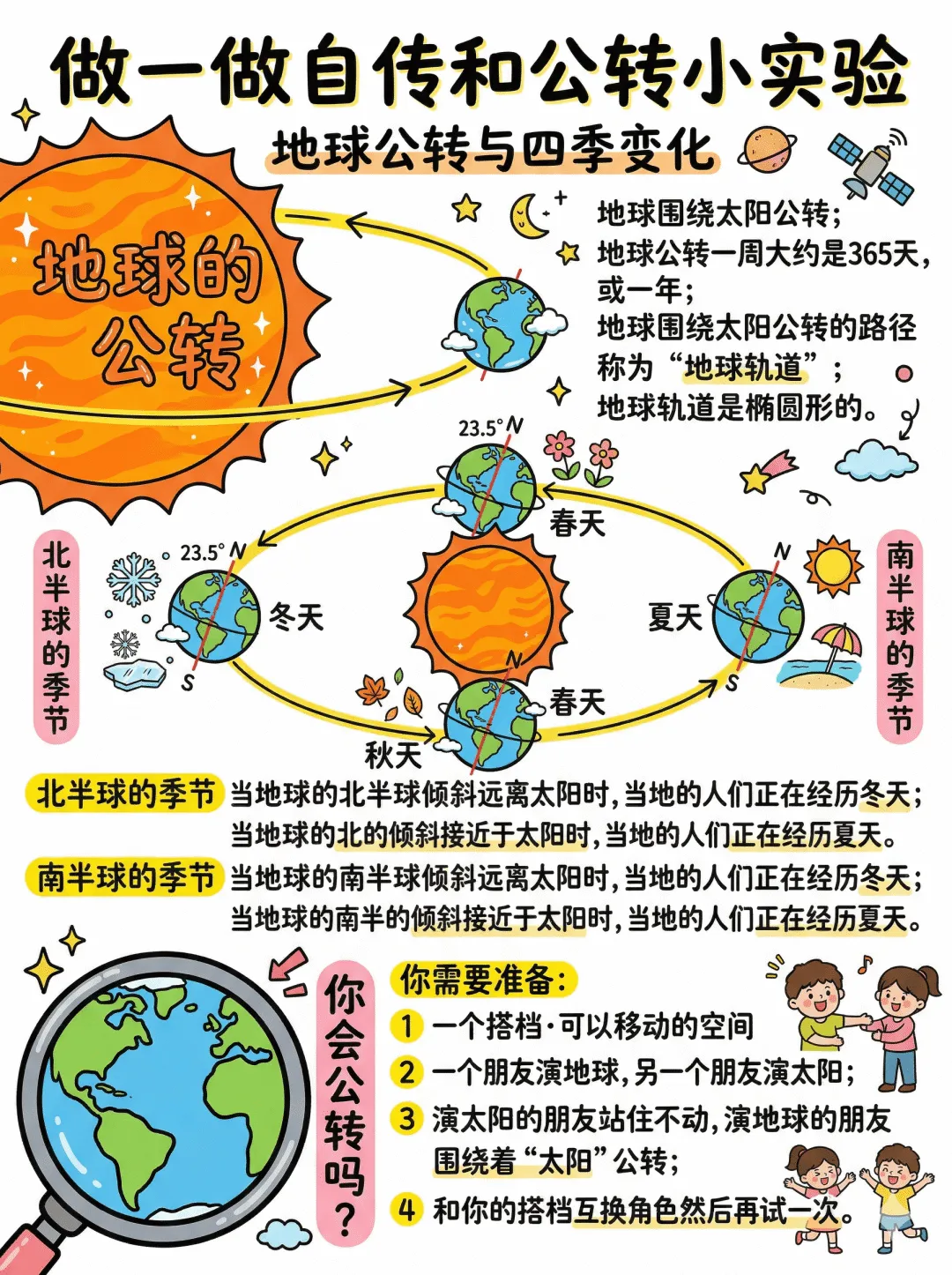 🌞 2. 边玩边学,秒懂自转与公转 白天黑夜怎么来?一年四季怎么变?资料里不仅有清晰直观的图解,还设计了超好玩的互动小实验!宝爸宝妈可以和宝宝互换角色,“一个演太阳,一个演地球”,在转圈圈的游戏中轻松搞懂地球自转(24小时)和公转(365天)的奥秘!