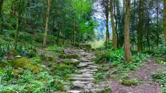 作为道教发源地,导航“大邑鹤鸣山道观”即可到达。鹤鸣山的徒步是身体和文化的双重修行。环线串联起道观、古遗址、丹霞地貌和观景台。穿行于丹霞怪石与原始竹林之间,登顶云雾观景台,俯瞰山岚如纱、梯田层叠——每一步都踩在历史上。
