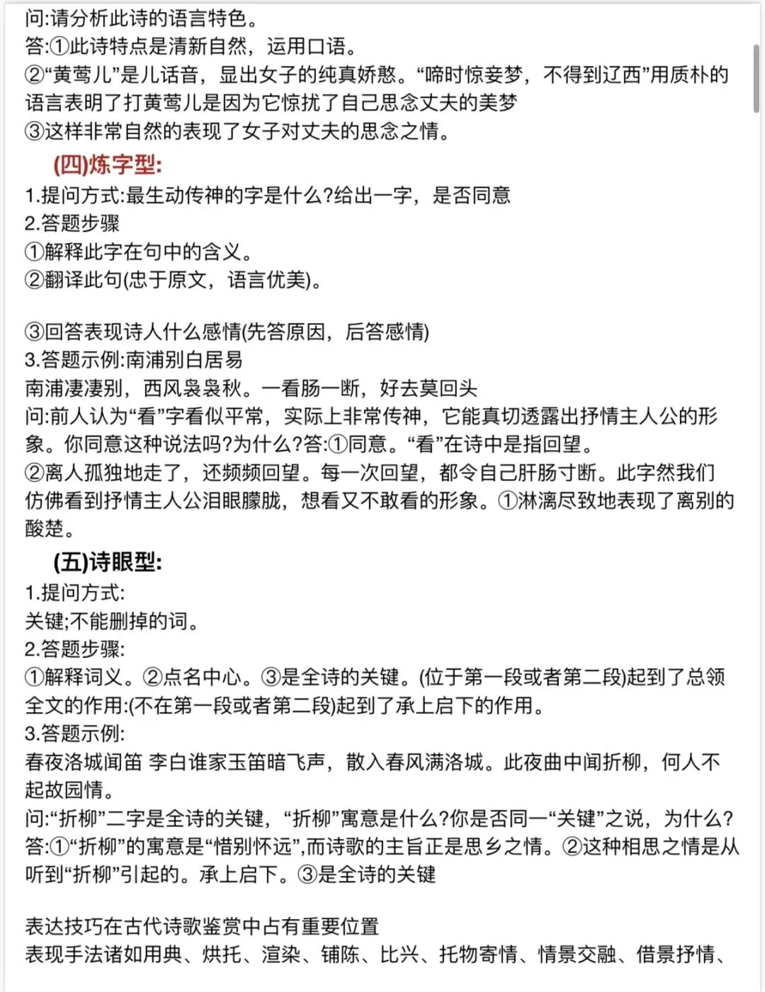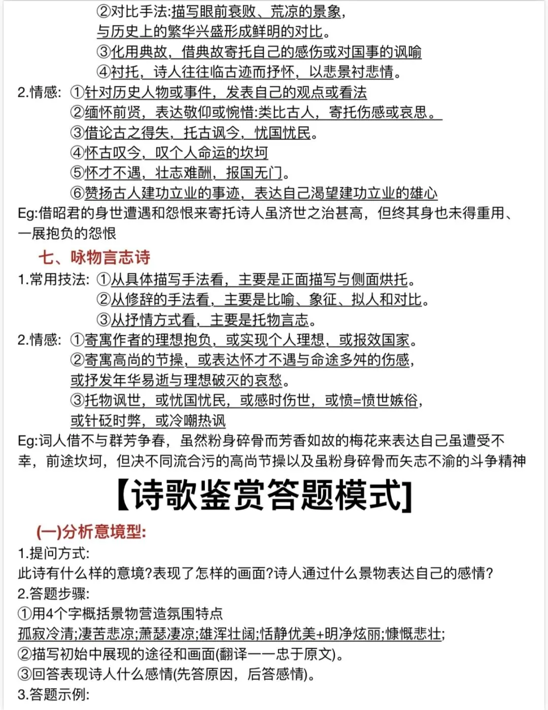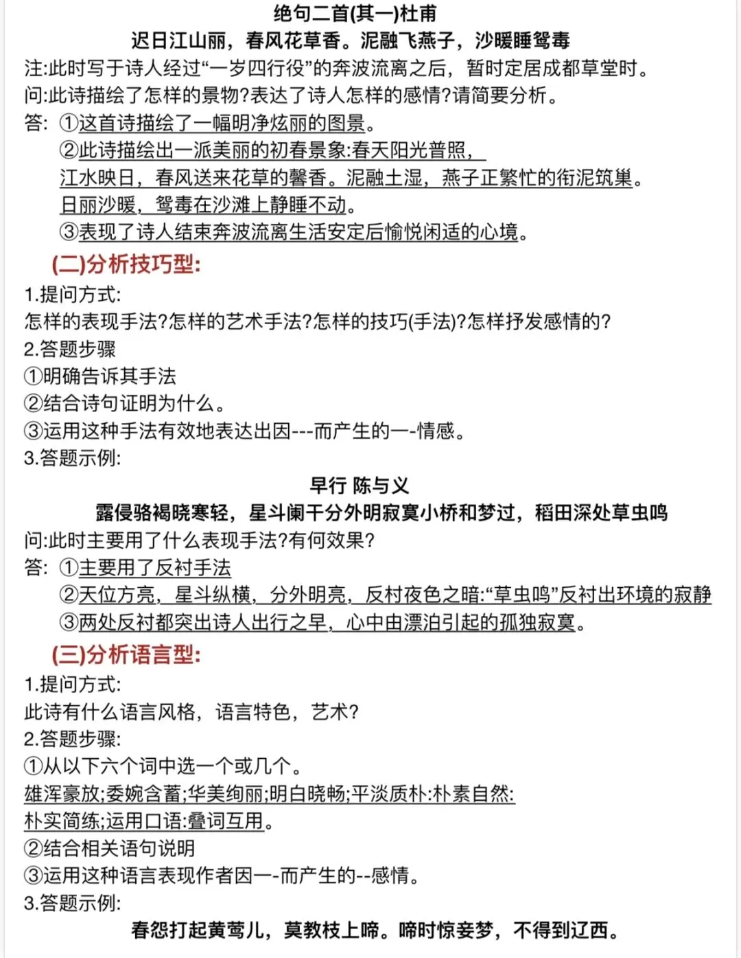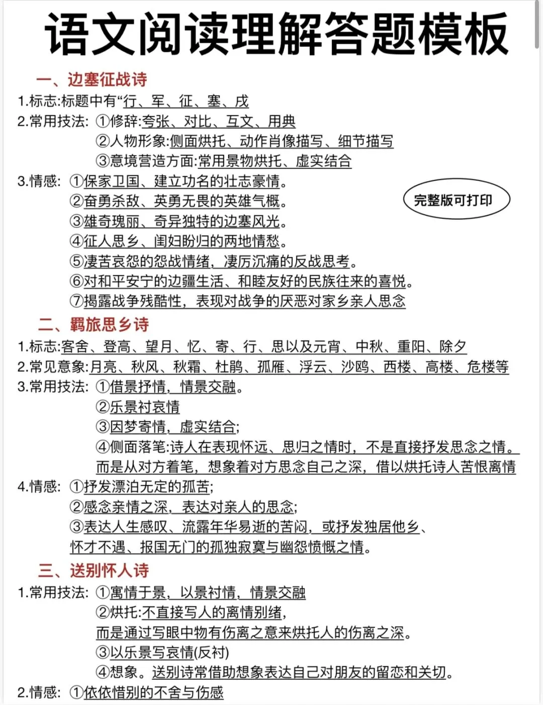 其中不仅覆盖了古诗词鉴赏类答题模板,还包括散文阅读,小说阅读,论述类文章,实用类模板,同学们一定要打印出来多学习这些技巧,在考场中简直屡试不爽,拿分拿到手软好吗?有他你还愁语文达不到135分吗?