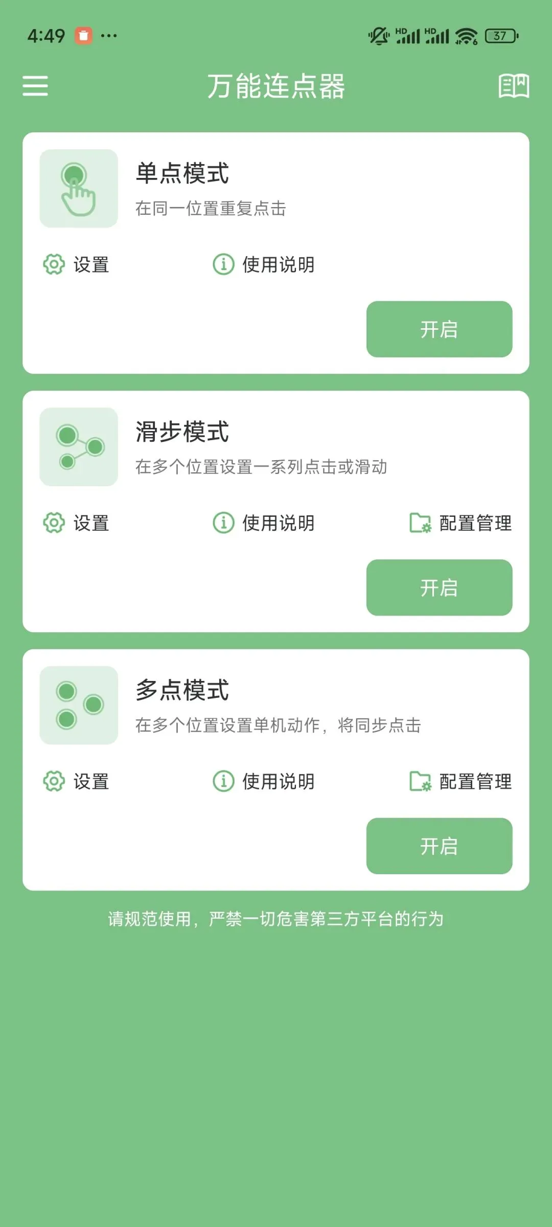 目前唯一要注意的是暂时只有安卓版本,iOS因为系统限制用不了,另外不要用它做违规的操作哦。平时经常有重复点击需求的小伙伴可以试试,真的能省不少力,也不用再点得手酸了。