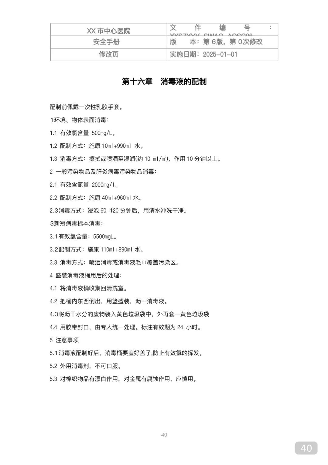• 物表消毒:含氯消毒剂(常用500mg/L~2000mg/L)