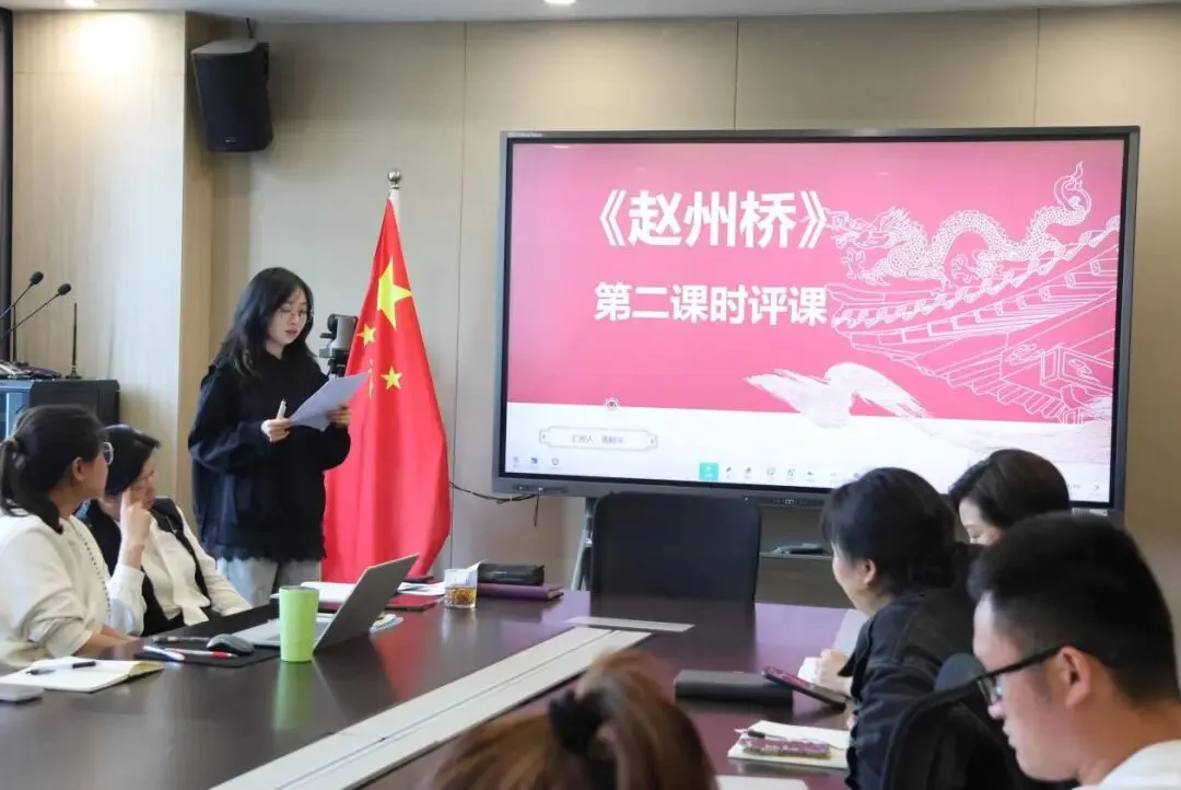 课后,两位老师进行了说课。洪老师从新课标指导思想入手,基于三年级下册第四单元的人文主题、语文要素以及课文编排,设计了“争做中华优秀传统文化宣传大使”的单元活动和“你会选择哪一种文化瑰宝让它被更多人了解”的驱动性问题。并针对学生对传统文化了解不够深入、阅读和鉴赏能力尚欠缺等问题,组织学生了解传统节日和古代科技,从而制定《赵州桥》的教学目标和情境任务。利用AI动画还原历史背景,帮助学生理解“创举”的意义;利用学习单提供“说桥”支架,提高学生完成度;利用评价表提供“代言”支架,实现了以评促学。学生在争做文化使者的过程中,激发了兴趣,完成了实践任务。