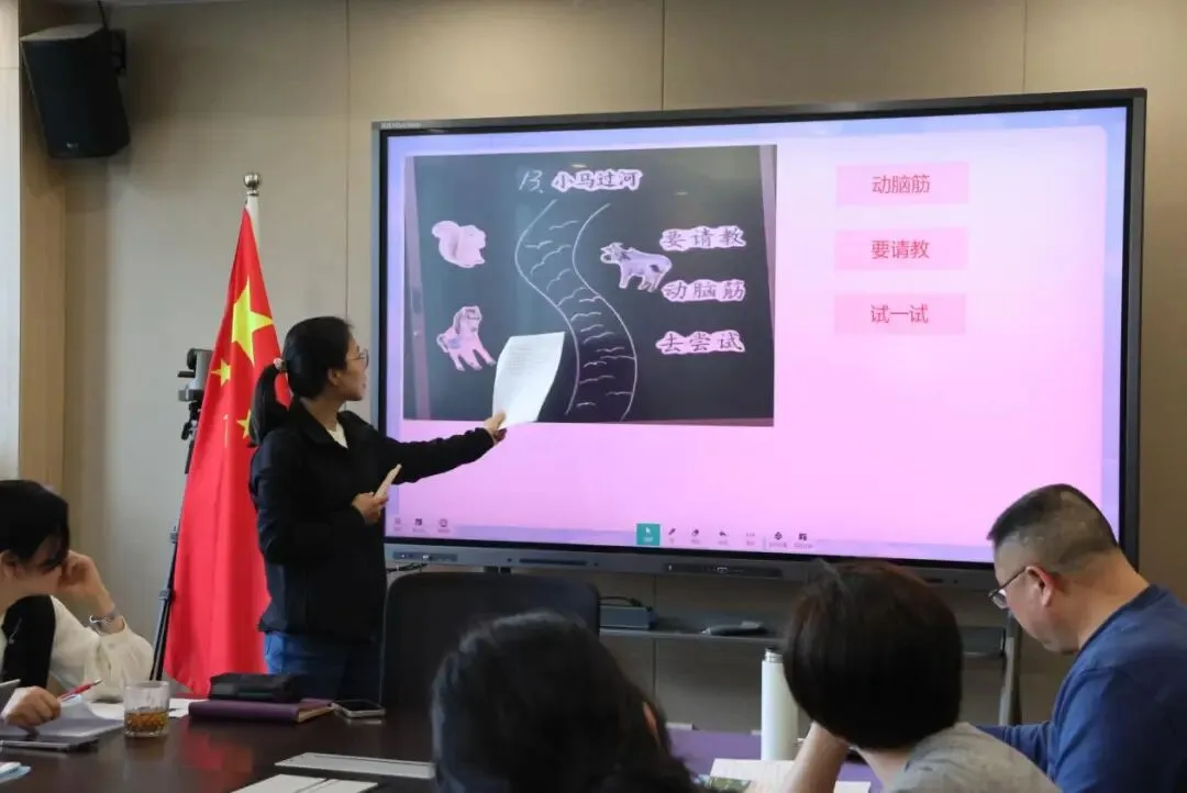 任老师以“小故事,大思辩:让低段孩子大胆试一试”为题分享了二下第五单元整体教学实践。根据课标“思辨性阅读与表达任务群”的要求、“思考与尝试”的人文主题和“根据课文内容,简单说说自己的感受或想法”的语文要素,任老师设定了“小小思考家,大胆试一试”的单元情境和“争当智多星”的任务。又结合本单元《寓言二则》《画杨桃》的学习经验,以及学生阅读与表达的学情调查,在《小马过河》一课中为孩子们搭建“大胆试一试”的平台。围绕“小马过河的秘诀”,引导学生读一读、说一说、演一演、辩一辩、评一评。学生在语言品析中体会人物的内心,在角色扮演中体验童话的乐趣,在辩论比赛中与懂得践行的道理,在多元评价中落实学习目标。