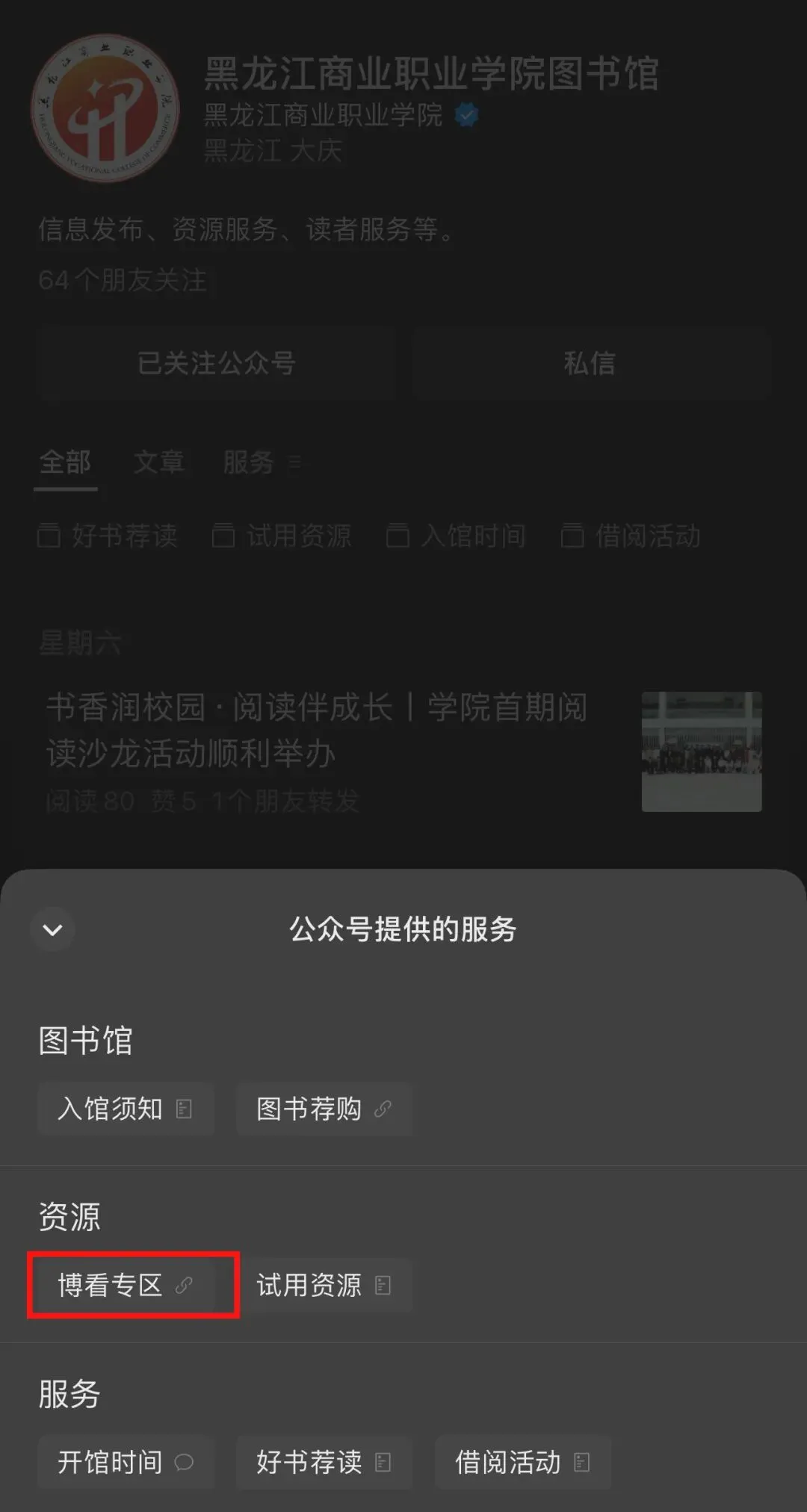 进入“黑龙江商业职业学院图书馆”微信公众号,点击底部菜单“资源”--“博看专区”--“博看AI书苑”,首次使用需要手机号注册,授权码:hljszy。