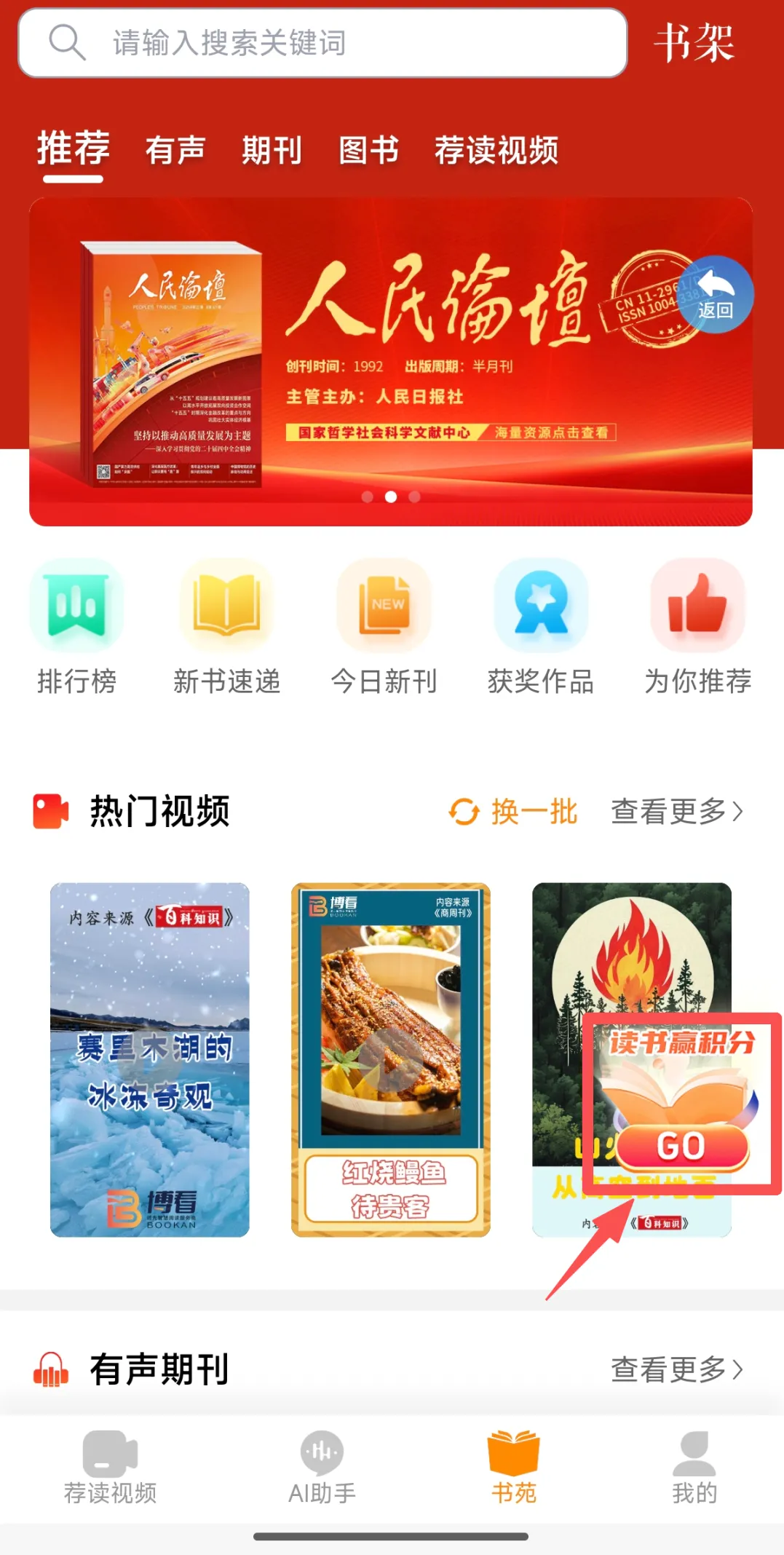 本次活动以图书馆微信公众号中“博看AI书苑”为载体,参与者除了完成签到、阅读等日常任务外,还可通过完成相关AI阅读任务获取额外积分,最终凭总积分排序获得奖励。