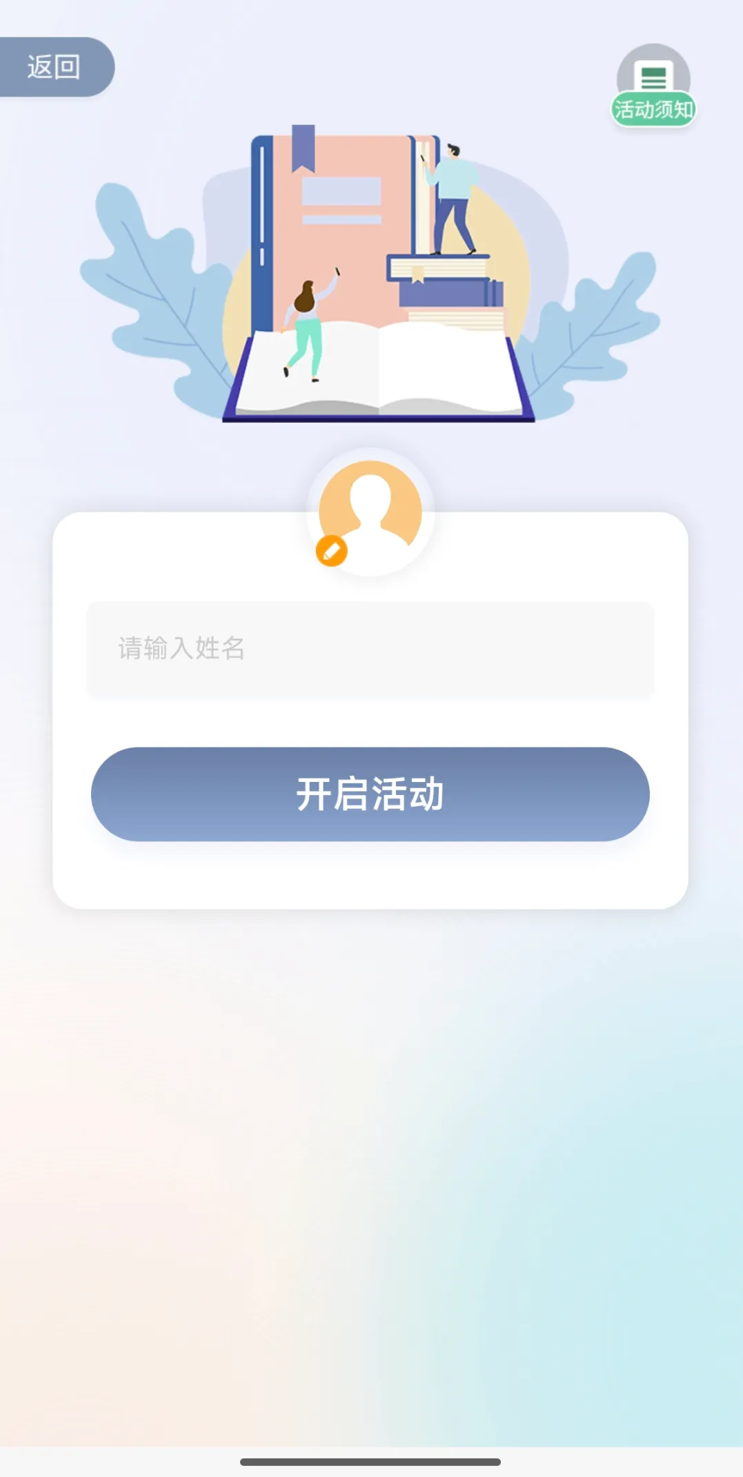 点击底部“活动”按钮,选择活动宣传图进入,点击首页“读书赢积分”浮窗进入,填写姓名,开启活动。