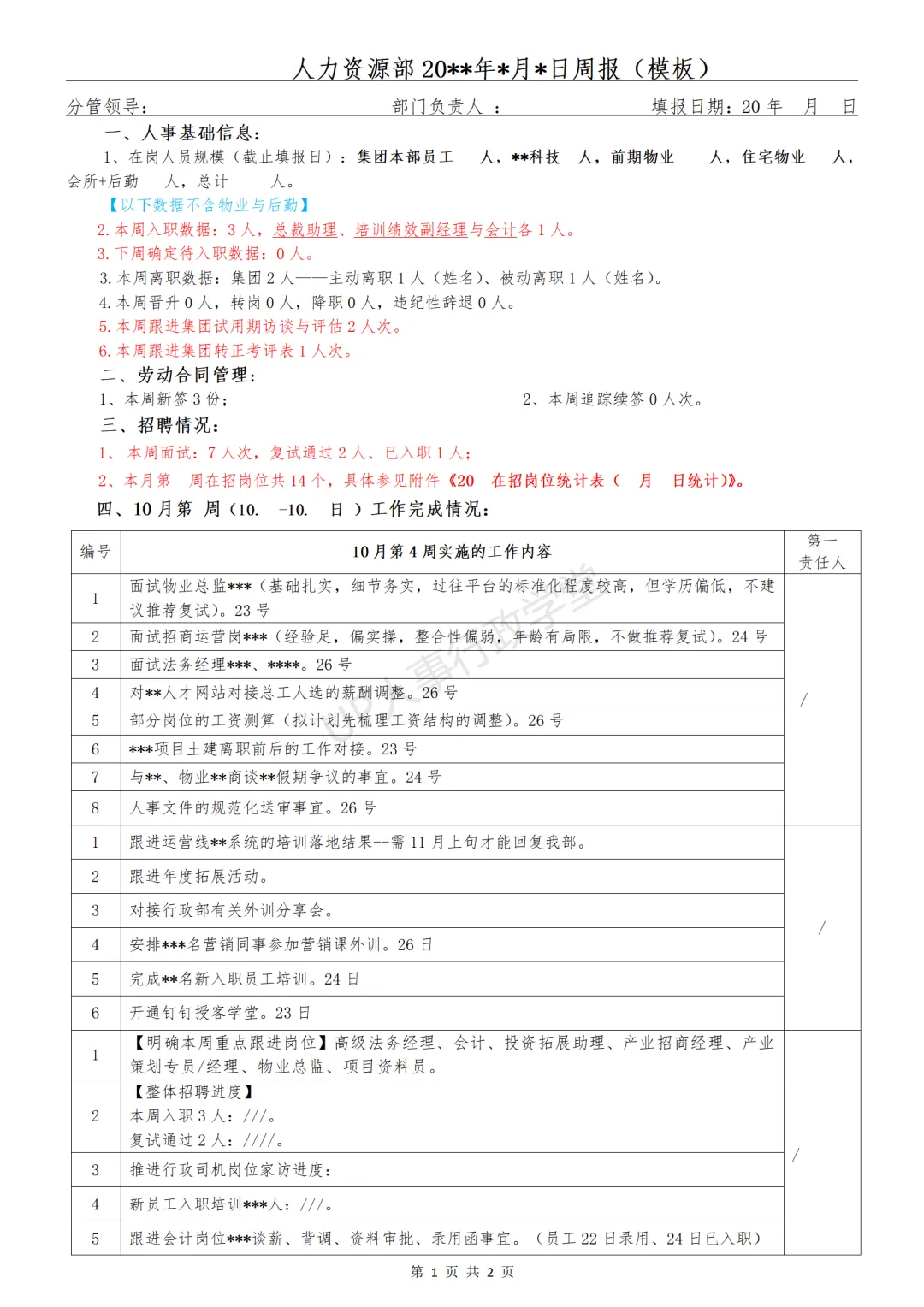 《行政人事周报》资料包内含37份人力资源与行政工作周报框架模板。