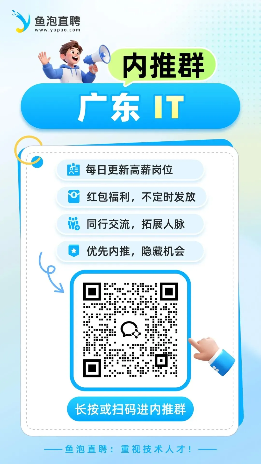 长按或扫描下方二维码,添加小助理微信,发送“入群”,加入鱼泡直聘求职群,与同行伙伴共享资源、互助成长!