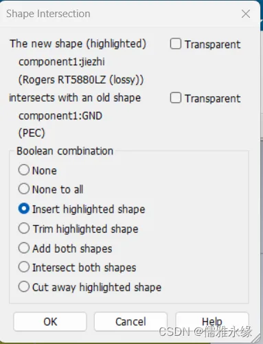 当建立的两个模型出现交叠时,CST会出现如下提示框,下面依次进行解释说明: