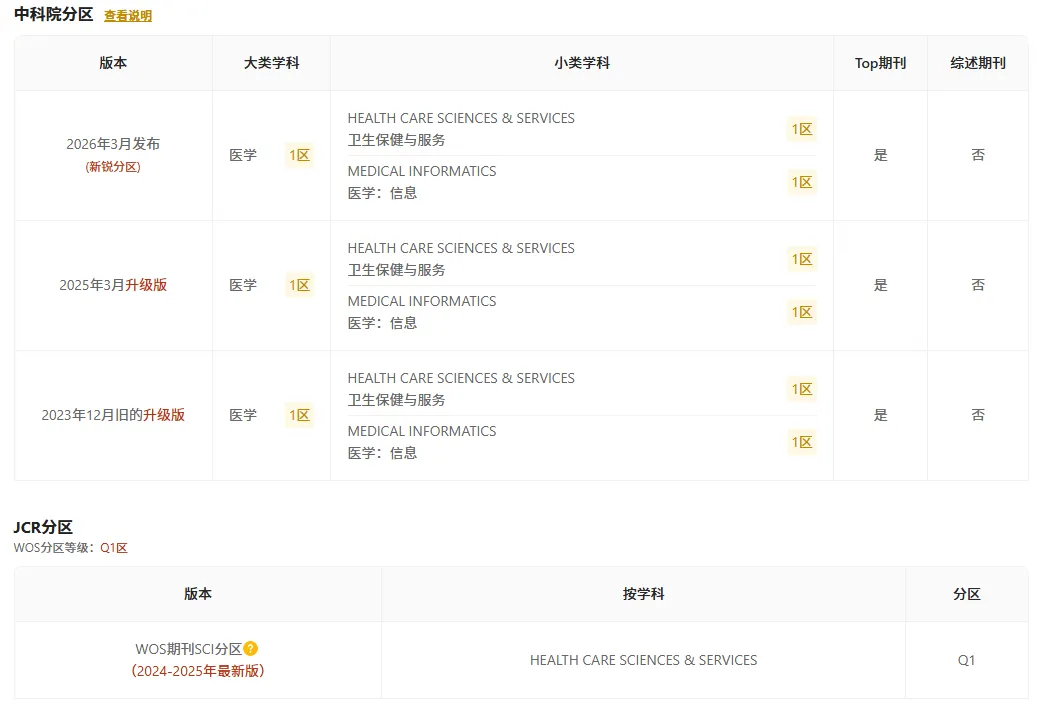 JCR 分区:Q1(医学信息学、卫生保健与服务)