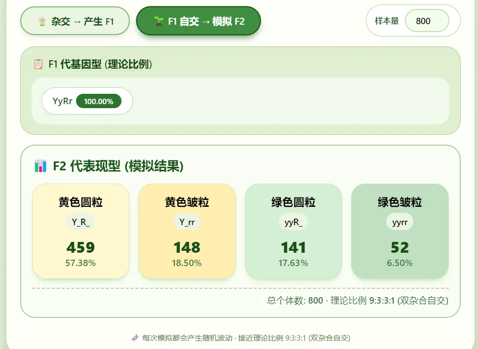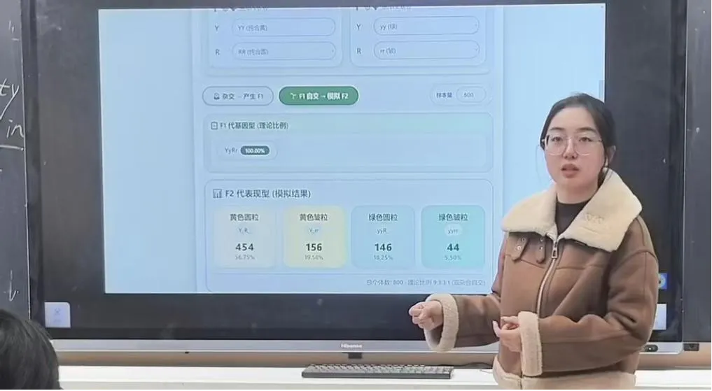 例如:利用DeepSeek生成HTML格式的自由组合实验模拟器,通过畅言平台分享给学生,学生可以在课堂、课后进行模拟F2连续自交的过程,辅助理解在大量重复实验后,性状比为9:3:3:1的统计学数据,弥补传统课堂的不足。