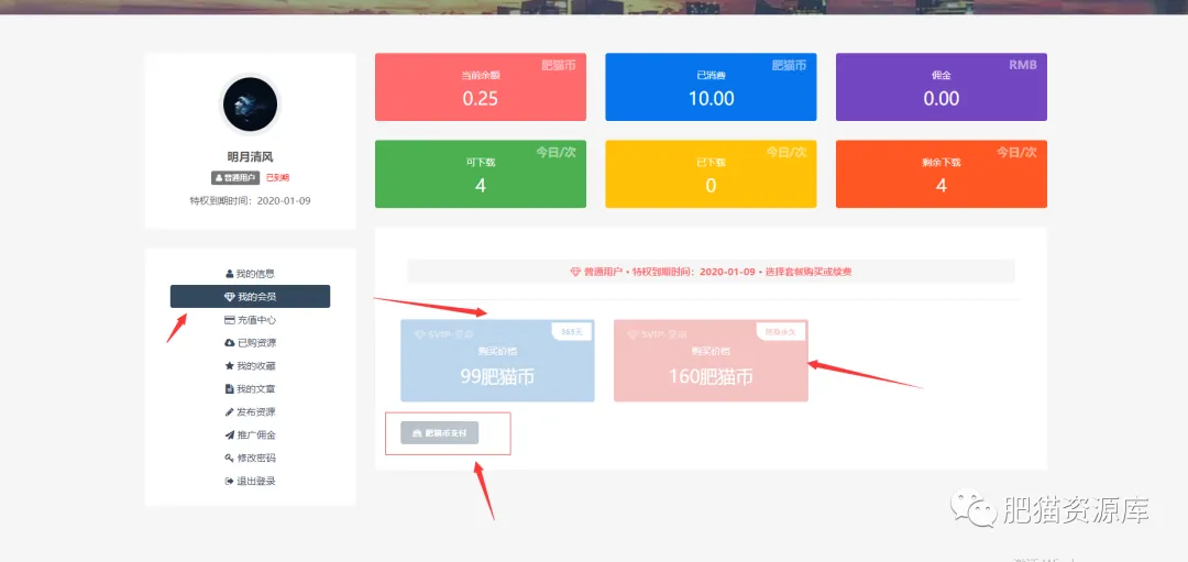 3,然后点击我的会员,用肥猫币支付,购买相应的会员,如您的肥猫币不足,请去上一步先充值肥猫币。