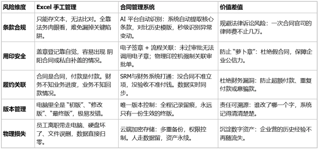 免费Excel vs 付费合同系统,差的不是钱,一表看懂⬇️
