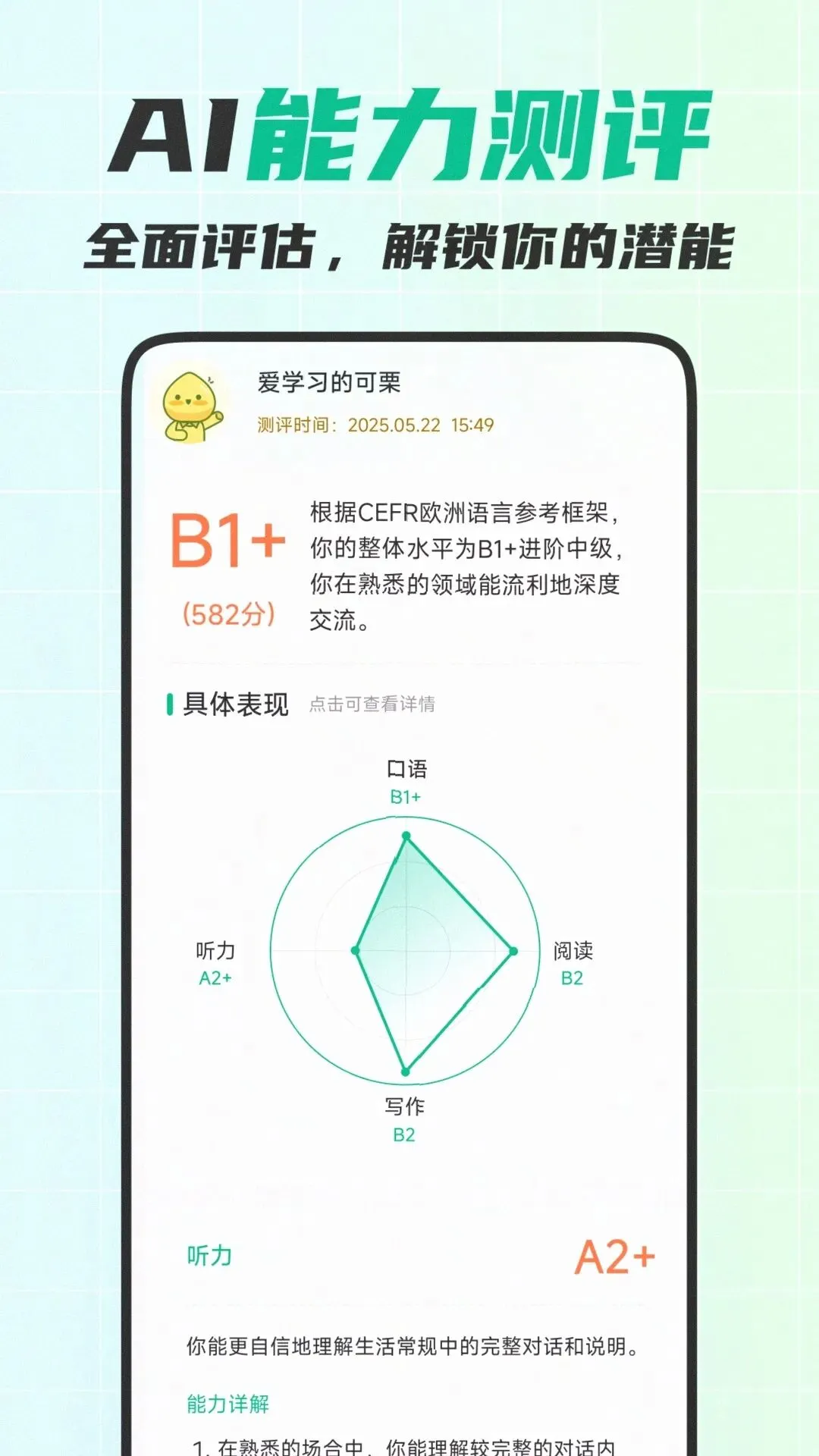 基于CEFR国际标准与艾宾浩斯遗忘曲线,可栗口语(Keli Speak)打造了从A0入门到B1小学毕业水平的32个进阶关卡,形成「测评练习反馈强化」的完整学习闭环。