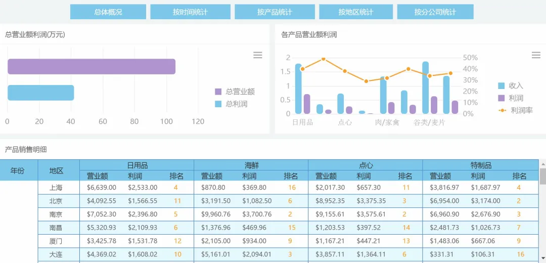 如果把这个过程放到工具里,情况就会好很多。像我们团队平时用的FineReport,一般会先把周报的模板设计好,比如哪些指标放在最显眼的位置,哪些数据要分组汇总,哪些地方要算同比环比,还有哪些内容要用图表展示,这些都能提前设置好。到时候只需要更新数据,模板会自动按照规则生成报表,再也不用每周手动拼表。它还支持参数查询和多种报表类型,不管是常见的分组表、交叉表还是更复杂的周报样式都能轻松实现。如果领导更关注整体经营情况,还能直接制作一个可视化页面,把核心指标、趋势变化和异常数据全都集中展示,一眼就能看明白重点。工具的链接我放在这里,建议你也点击文末【阅读全文】亲自体验一下。