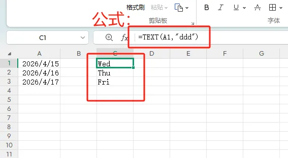 解读😜:A1填目标日期,输入公式后,直接返回 Mon、Tue、Wed、Thu 等英文星期缩写,简洁利落,适配英文简版报表、涉外台账哦!