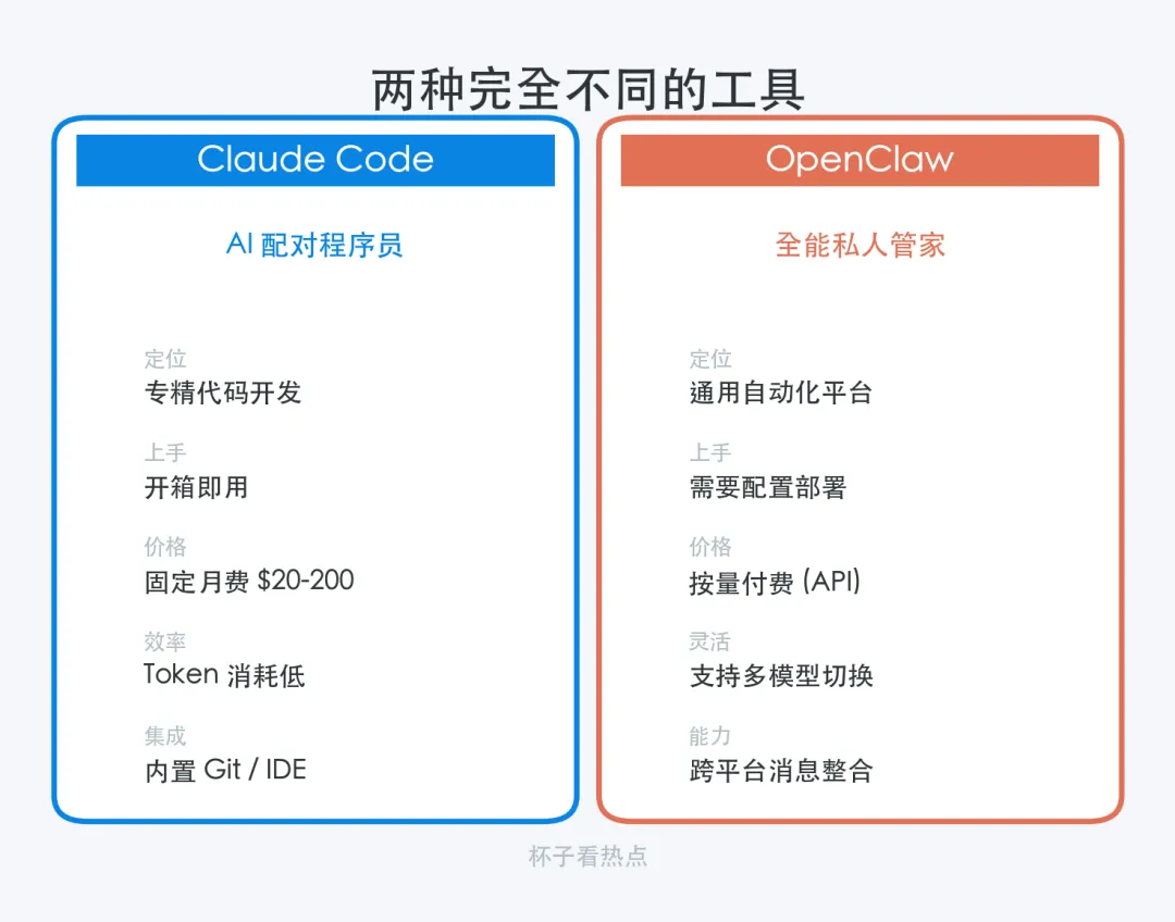 一个有意思的细节:OpenClaw本身的代码,100%是用Claude Code自动生成的。这也从侧面说明了两者的定位差异——Claude Code是专精工具,OpenClaw是这个工具造出来的通用载体。