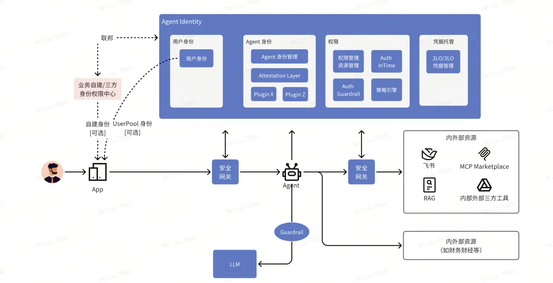 入站认证: 验证调用Agent的用户身份(支持自建用户池和外部IDP: 字节SSO, 飞书, Google Identity等)。