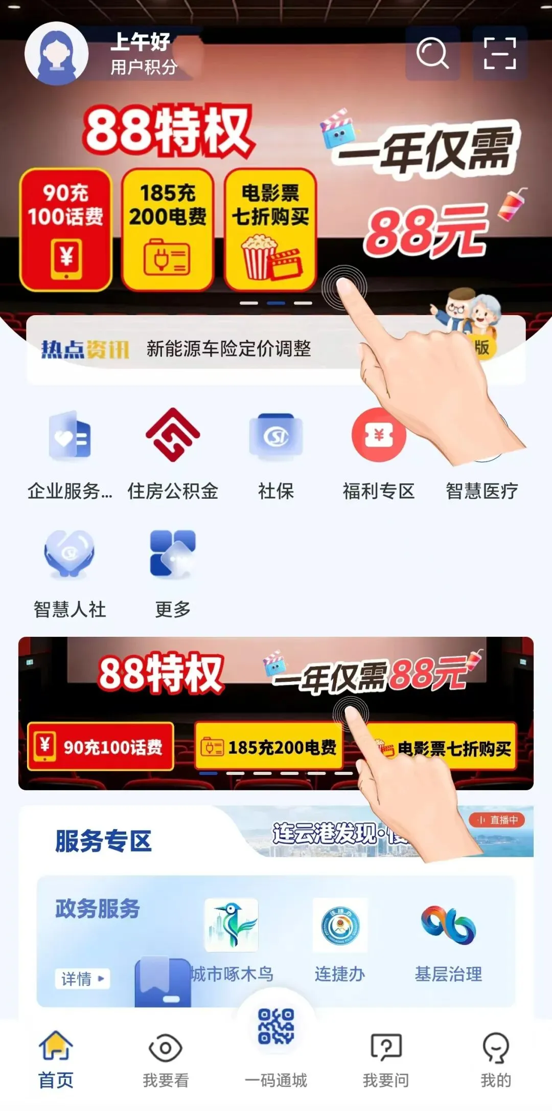 1️⃣ 打开 “我的连云港”APP,点击首页 轮播图,直接进入~