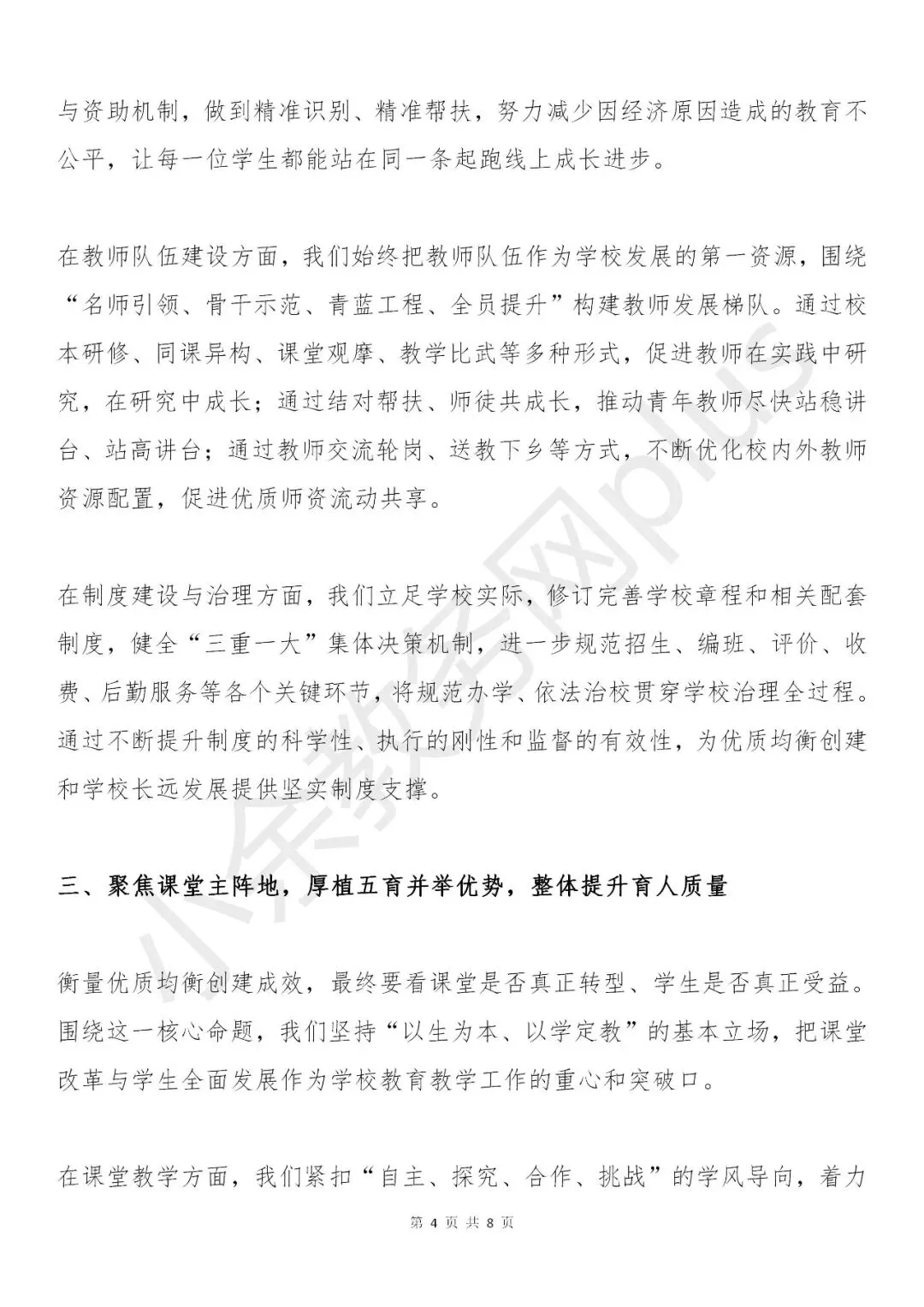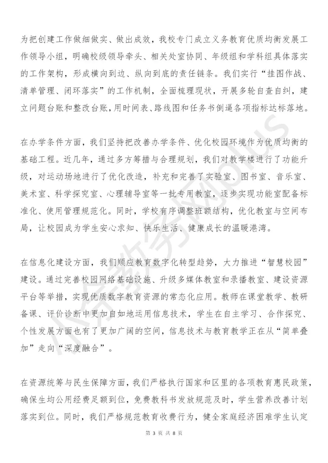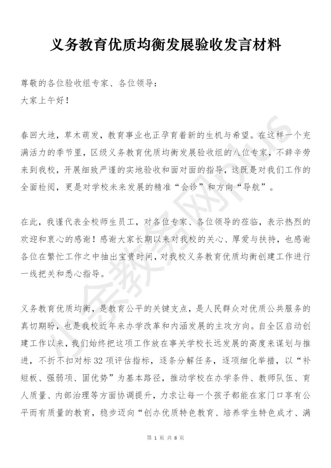 学校义务教育优质均衡发展验收发言材料模板推荐学校义务教育优质均衡发展验收发言材料模板推荐。「小余教务网」是一家专注教师资料、校领导资料、班主任资料、德育资料等大而全的教务资料平台。下面是这份文档资料的预览。(篇幅有限,只展示部分)备注:文档可编辑可修改(原始文档无水印、无马赛克)。