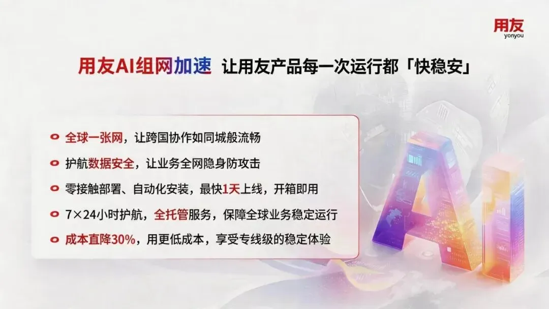 为破解跨国网络瓶颈这一痛点,用友正式推出“AI组网加速服务”。深度适配中企出海全场景需求,为用友BIP、YonSuite、U9C等产品全面护航!让全球化数智运营从「慢卡断」变为「快稳安」,让您的用友产品在全球任何角落都能实现“如同城般流畅”的极致体验。只要您是用友客户就能尊享免费试用、满意再签约的无忧模式,承诺效果,价值先行。