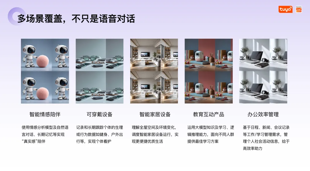 在实时语音交互层面,涂鸦构建了极具竞争力的对话式AI引擎,实现了全球平均仅1.3秒的端到端超低延时。系统支持极速打断、滑动语义VAD提取以及声纹追踪,配合涵盖306种以上方言及海外语种的本地化音色库与深度的情绪增强算法,彻底拉近了AI与用户的距离。