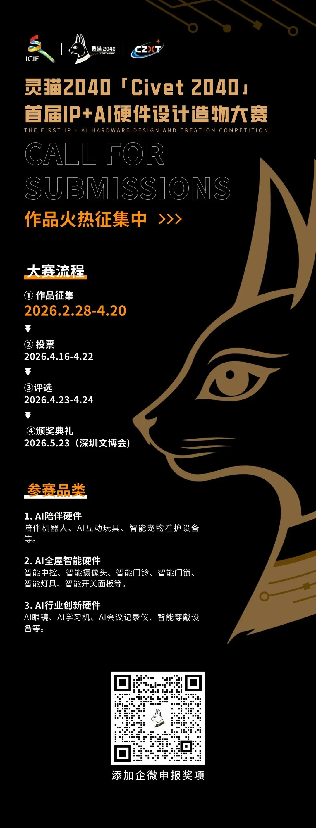 首届“灵猫2040”IP+AI硬件设计造物大赛由腾讯云、阿里云、火山引擎联合主办,设置AI陪伴硬件、AI全屋智能硬件、AI行业创新硬件三大赛道。目前仍在接受作品报名,截止时间4月20日。