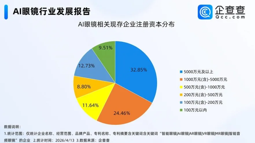 4月14日,企查查公布的最新数据显示,截至2026年4月13日,国内现存AI眼镜相关企业数量已达6033家,整个产业呈现出明显的区域集聚特征,资本实力雄厚,且由老牌企业主导的发展态势。