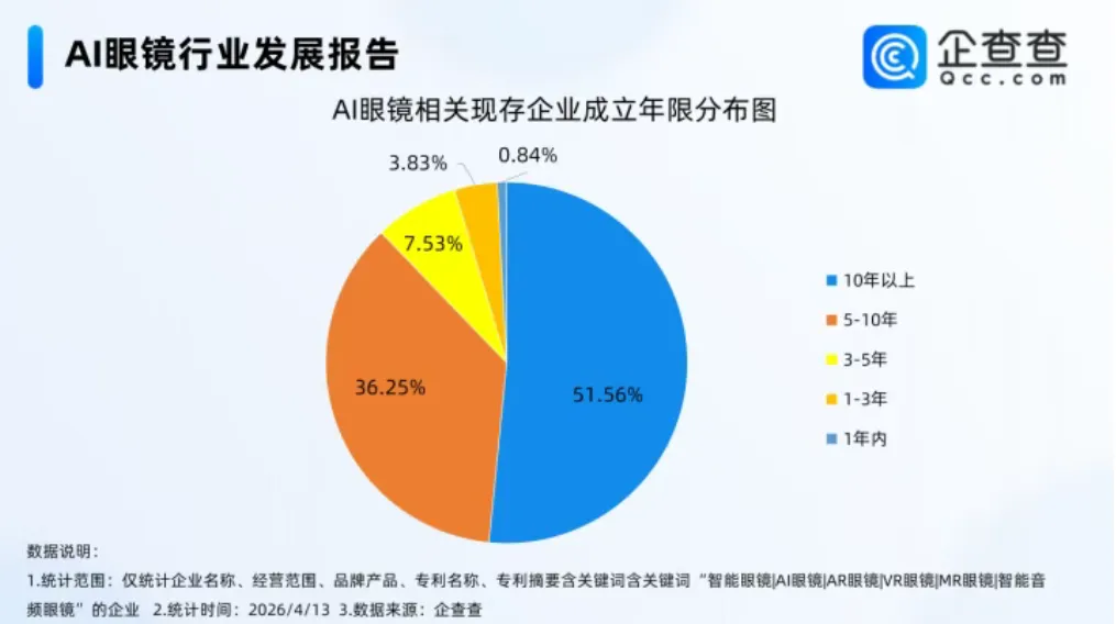 从企业经营年限的角度观察,国内AI眼镜行业积累了深厚的发展底蕴。成立10年以上的企业占比51.56%,这些企业历经市场的洗礼和行业的变迁,积累了丰富的经验和技术;成立5至10年的企业占比36.25%,正处于发展的上升期,具有较强的创新活力和市场竞争力;而成立不足3年的新企业占比不到5%,这表明行业以长期深耕的老牌企业为主体,新进入者面临较高的门槛和激烈的竞争。