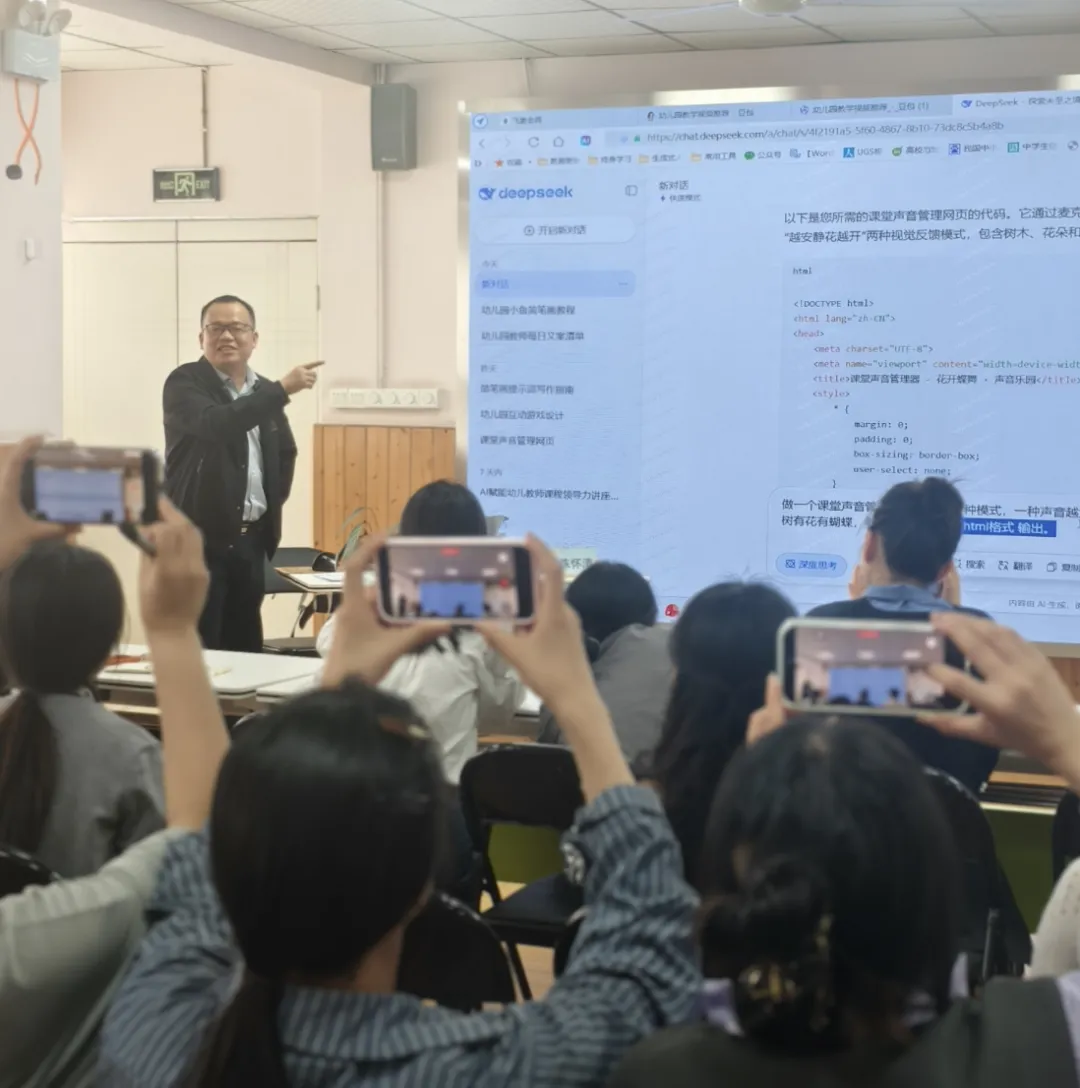 陈怀清主任结合学前教育实际,引入 “人机协同” 理念,帮助教师理解 AI 从辅助工具到教学伙伴的转变,引导大家跳出 “只会用工具” 的表层认知,实现教育思维的深层升级。培训中,陈主任通过现场实操演示,让教师直观感受 AI 在日常工作中的强大赋能作用。从幼教资源精准搜索、教学视频提取转写、简笔画与环创素材一键生成,到课题辅助、文献梳理、观察记录优化,一系列贴合幼儿园场景的实用操作,生动展现了 AI 如何为教师减负、提质、增效。