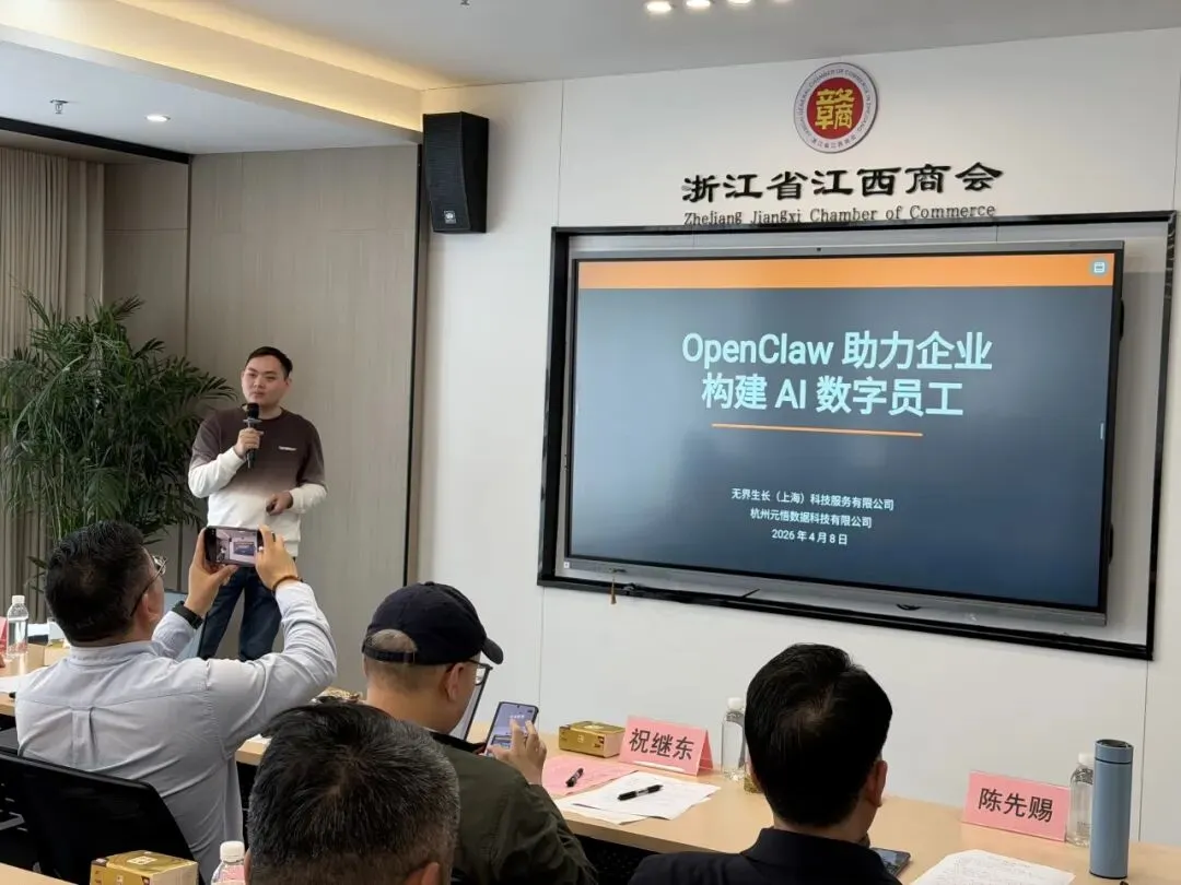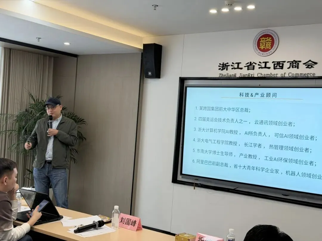2026年4月8日,浙江省江西商会学习交流会在杭州市临平区赣商大厦举行。本次会议以“AI赋能企业增长 · 投资助力价值提升 · 健康护航高质量发展”为主题,特邀嘉宾杭州至顶教育科技有限公司CEO、AI实战及领导力专家刘国峰,杭州元悟数据科技有限公司CEO、至顶教育AI专家罗康(无界)及商会常务副会长祝继东、副会长兼副秘书长刘雲、副会长王延寿、蒋小平、吴根福、李金鹏、陶继军、郭华明、魏运星等商会成员齐聚一堂,共学共进。