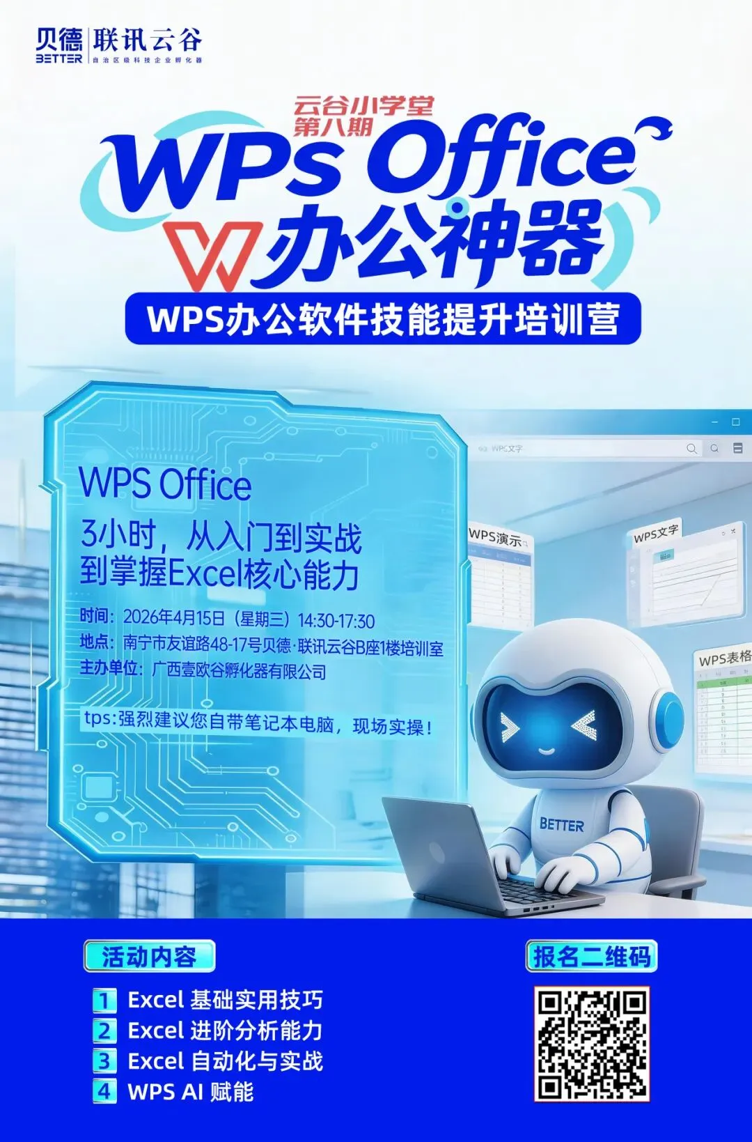 为切实响应园区企业需求,提升企业职工办公效率,破解日常办公效率难题,4月15日,由广西壹欧谷孵化器有限公司主办的云谷小学堂第八期 ——WPS办公软件技能提升培训营在贝德・联讯云谷圆满举办。本次培训聚焦实用办公技巧,干货满满、互动热烈,帮助参训学员解锁高效办公新方式,收获一致好评。