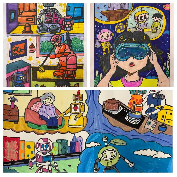 一年级小朋友以“我心目中的 AI”为主题绘制科幻画,用五彩画笔勾勒出心中的AI世界。呆萌可爱的机器人、充满想象的科技校园、神奇的智能工具纷纷跃然纸上,每一笔色彩都承载着童真,每一幅作品都藏着对 AI 未来的美好憧憬与无限向往。