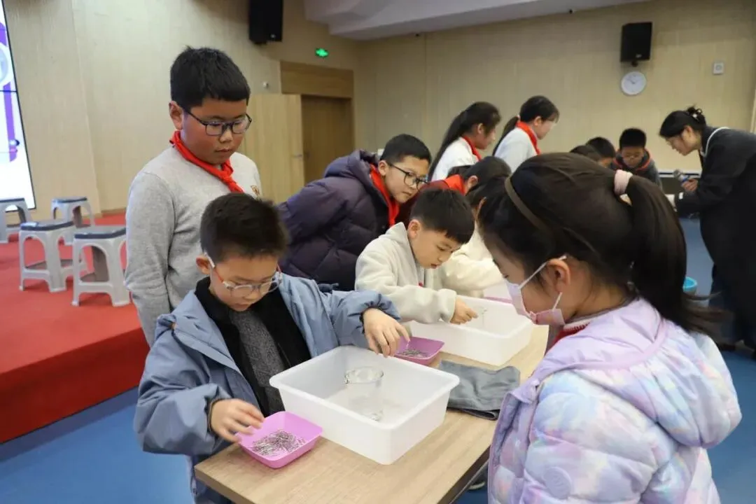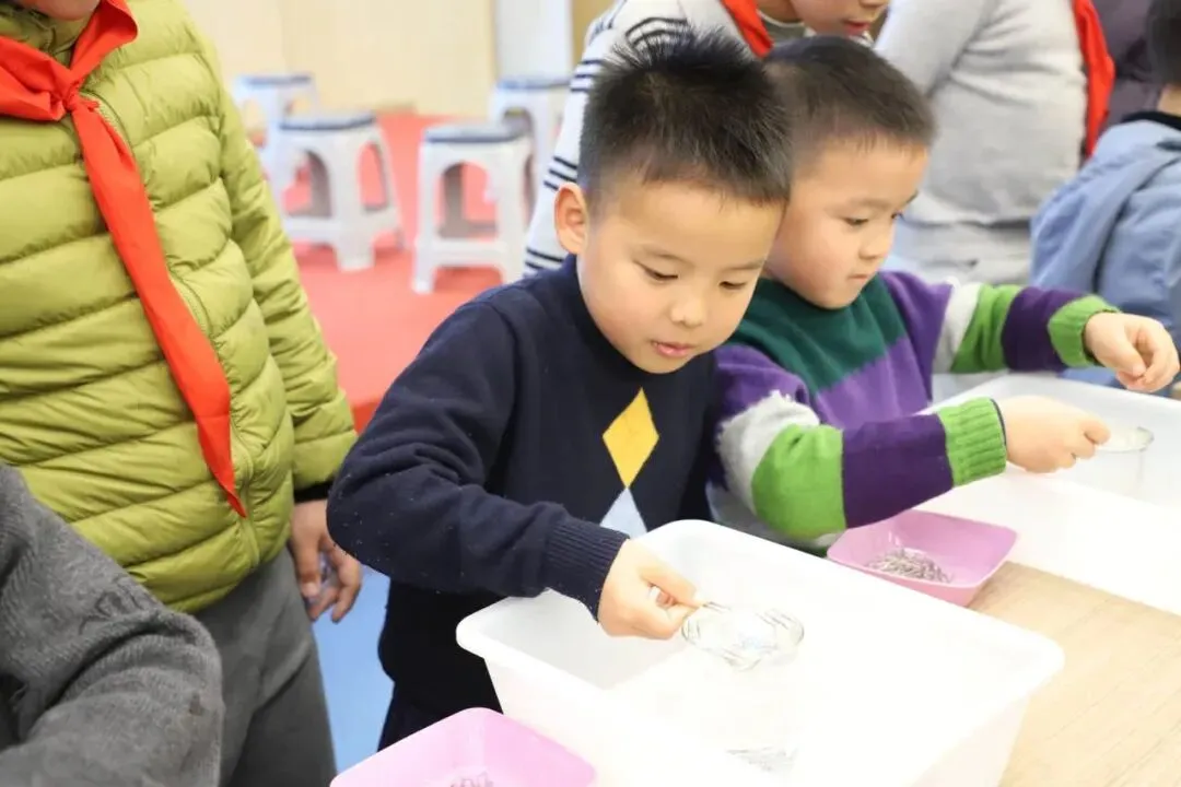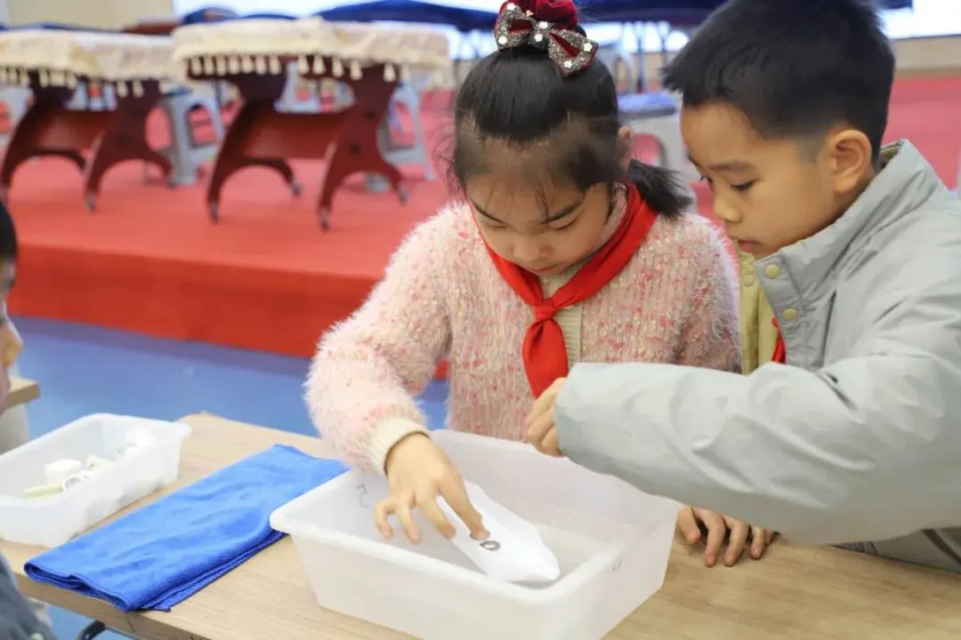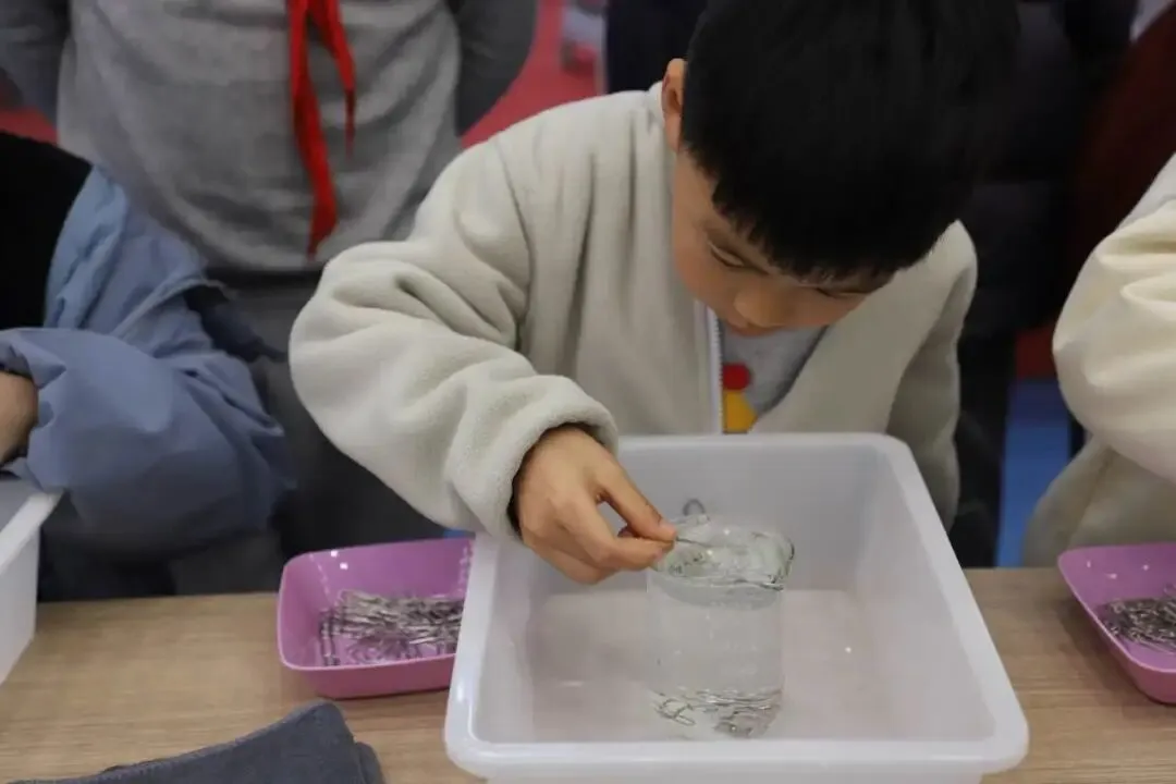 小选手们个个屏息凝神,指尖轻缓又专注,小心翼翼地将回形针轻放于水面之上。借助神奇的水的表面张力,小小的回形针稳稳“漂浮”在水面,没有沉入水底。孩子们在这一奇妙的科学现象中,不仅感受着科学的神奇,更在专注操作中体会到耐心与细致的力量,收获满满成长。