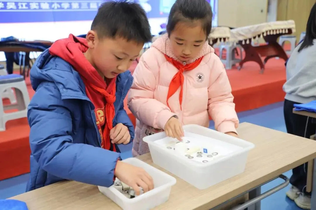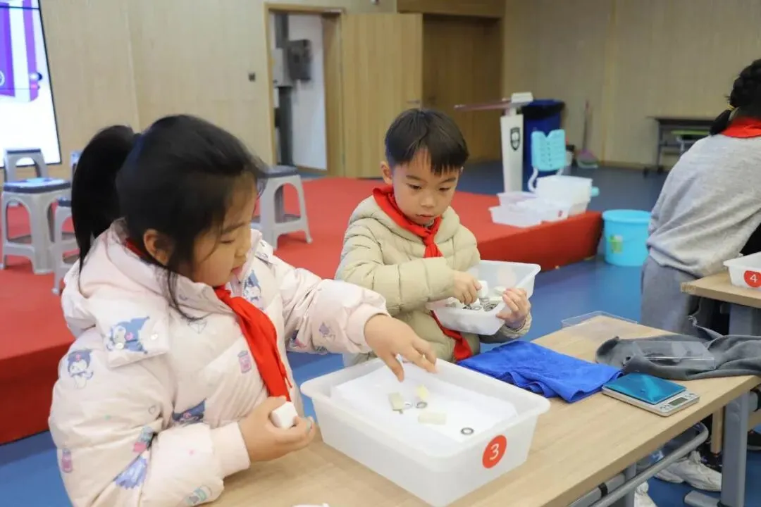 孩子们化身“小小造船师”,用一张A4纸亲手折出专属“小货船”,将金属垫圈、砝码等小物件逐一放入船中开展承重比拼,最后称重统计承载重量,直观理解浮力与排开水量的密切关系,在探索中收获知识与快乐。