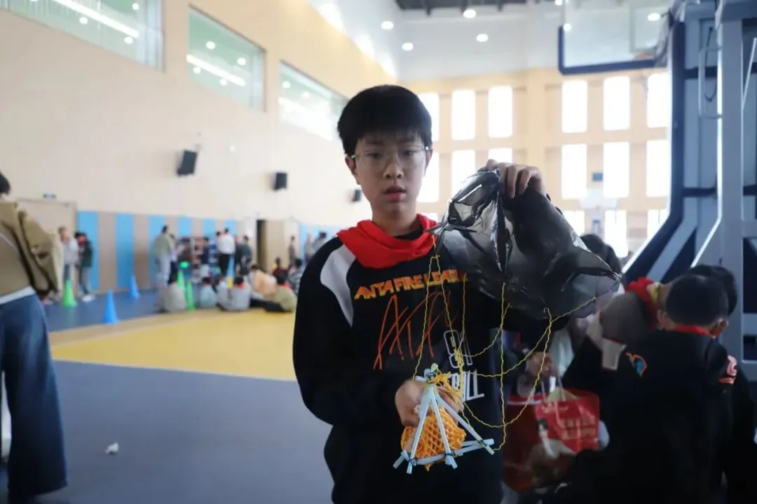 护蛋大挑战,创意无极限!选手们化身“小小工程师”,精心制作降落伞装置,护送鸡蛋从10米高处平稳降落。一个个创意降落伞缓缓飘落,鸡蛋完好无损安全落地。孩子们在趣味挑战中感受空气阻力的神奇,轻松解锁科学原理,锤炼创意与动手能力。