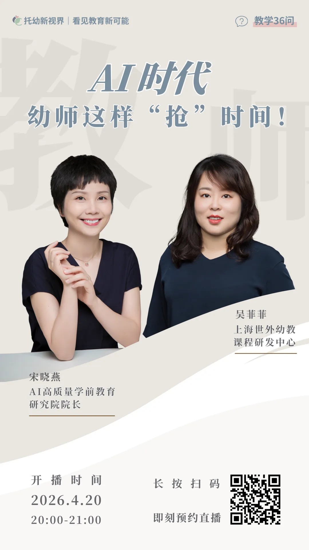 4 月 20 日晚 8:00-9:00,"托幼新视界"首期直播即将与大家见面。 AI高质量学前教育研究院院长宋晓燕、上海世外幼教课程研发中心吴菲菲,将带来【AI 时代,幼师这样"抢"时间】主题分享。