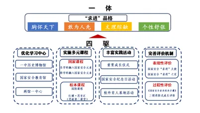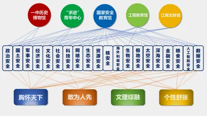 无锡市第一中学将总体国家安全观教育与“求进”品格涵育深度融合,创新构建“一体四驱”育人路径:优化历史博物馆、国家安全教育馆等学习场境,开发国防课程、“红楼·思享汇”等多元课程,开展成长节点、纪念日及实境研学等丰富活动,并建立表现性与过程性相结合的评价机制。
