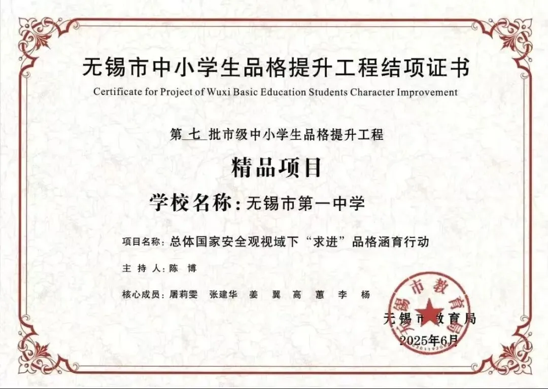 近年来,学校获评了全省中小学国家安全教育试点学校,市级品格提升项目“总体国家安全观视域下‘求进’品格涵育行动”获评精品项目,相关经验被省市级媒体多次报道,为新时代国家安全教育提供了生动样本。