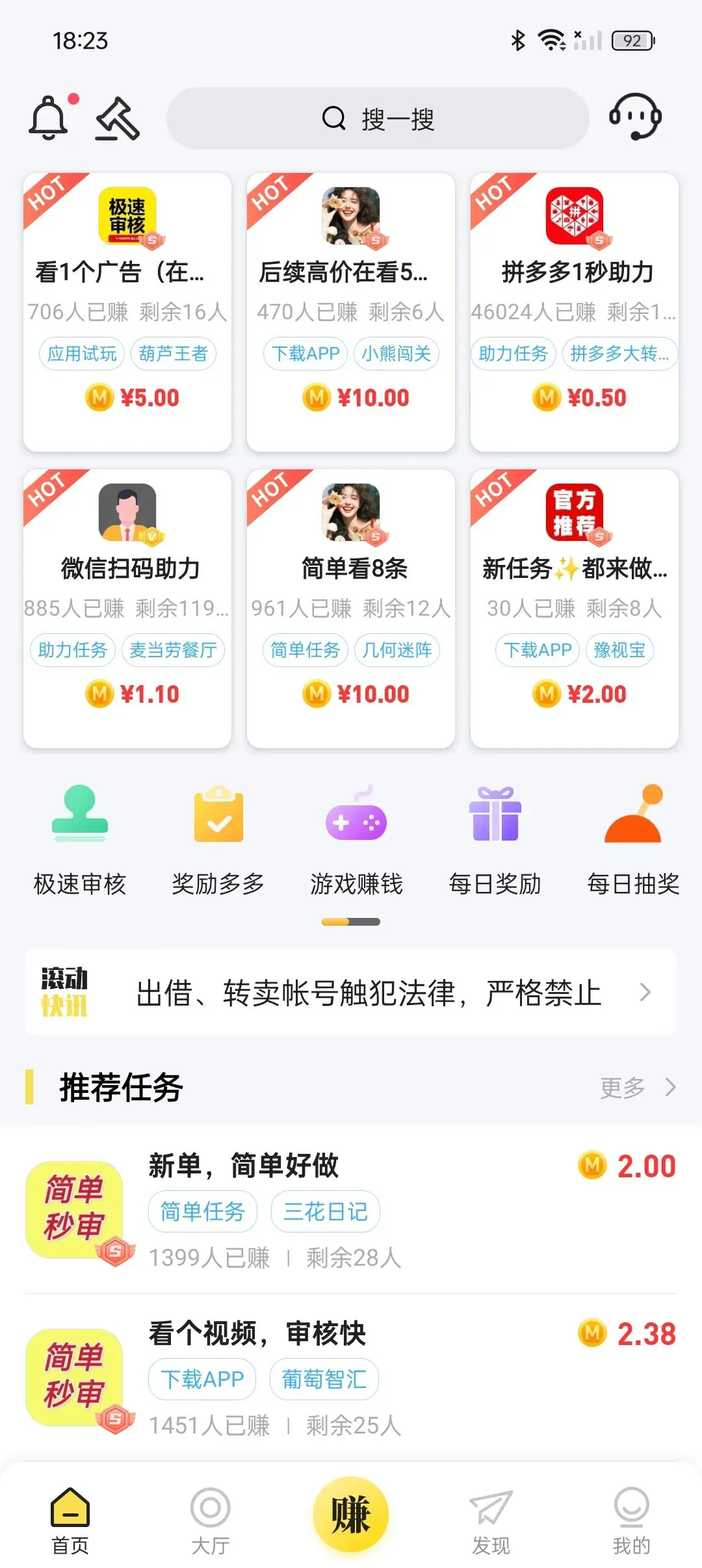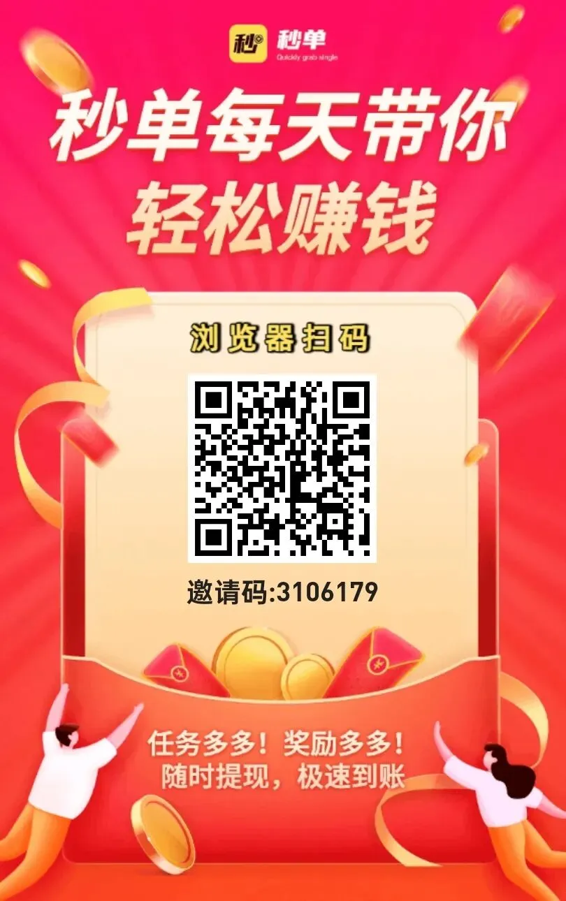 秒单是一个通过完成悬赏任务来赚钱的游戏平台。只要按照任务要求做好就可以拿钱,任务种类超多,比如试玩游戏,注册账号,参与投票等等。这款软件大量的赚钱任务都非常的简单,利用手机线上随时随地就能完成,只要我们每完成一个任务最低能获得几毛钱至几块钱的奖励,如果完成的是一个复杂任务那么就最低能获得十几元的奖励,完成的任务越多,收入也就越多。在赏帮赚上赚取的奖励满1元即可提现,没有任何的门槛限制,支持提现到微信或者支付宝上。
