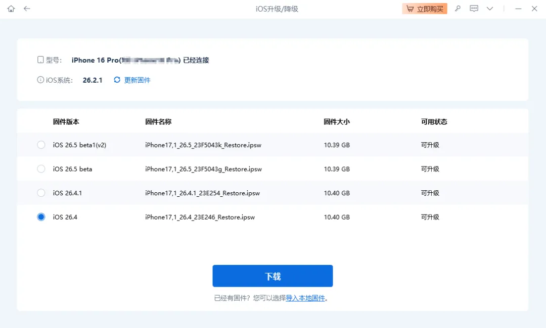 步骤3:选择需要升级的固件版本后,点击【下载】等待开始下载iOS固件