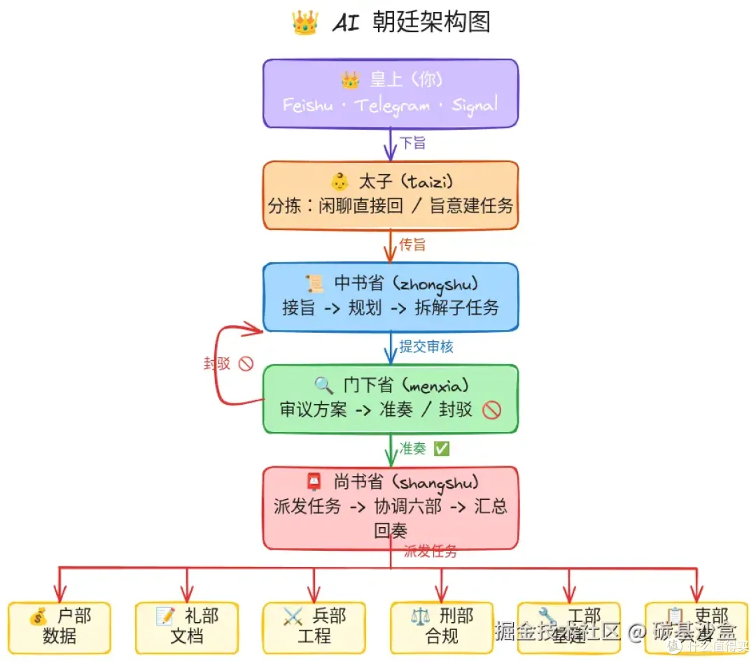 这套逻辑是这么玩的:你(用户)扮演皇上,下达一个旨意;AI太子负责分拣;AI中书省负责做规划;AI门下省负责审核;AI尚书省负责派发;最后交给AI六部(户、礼、兵、刑、工、吏)去执行;完成后,再给你呈上一份奏折。