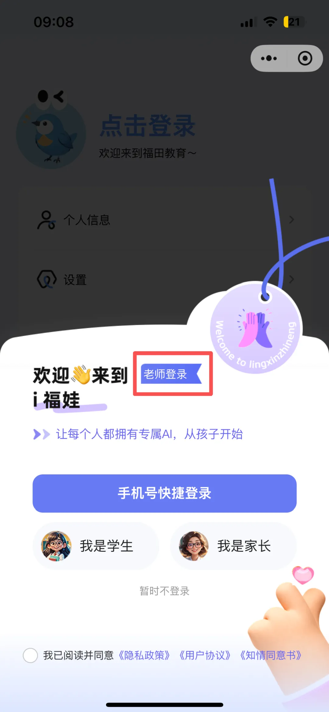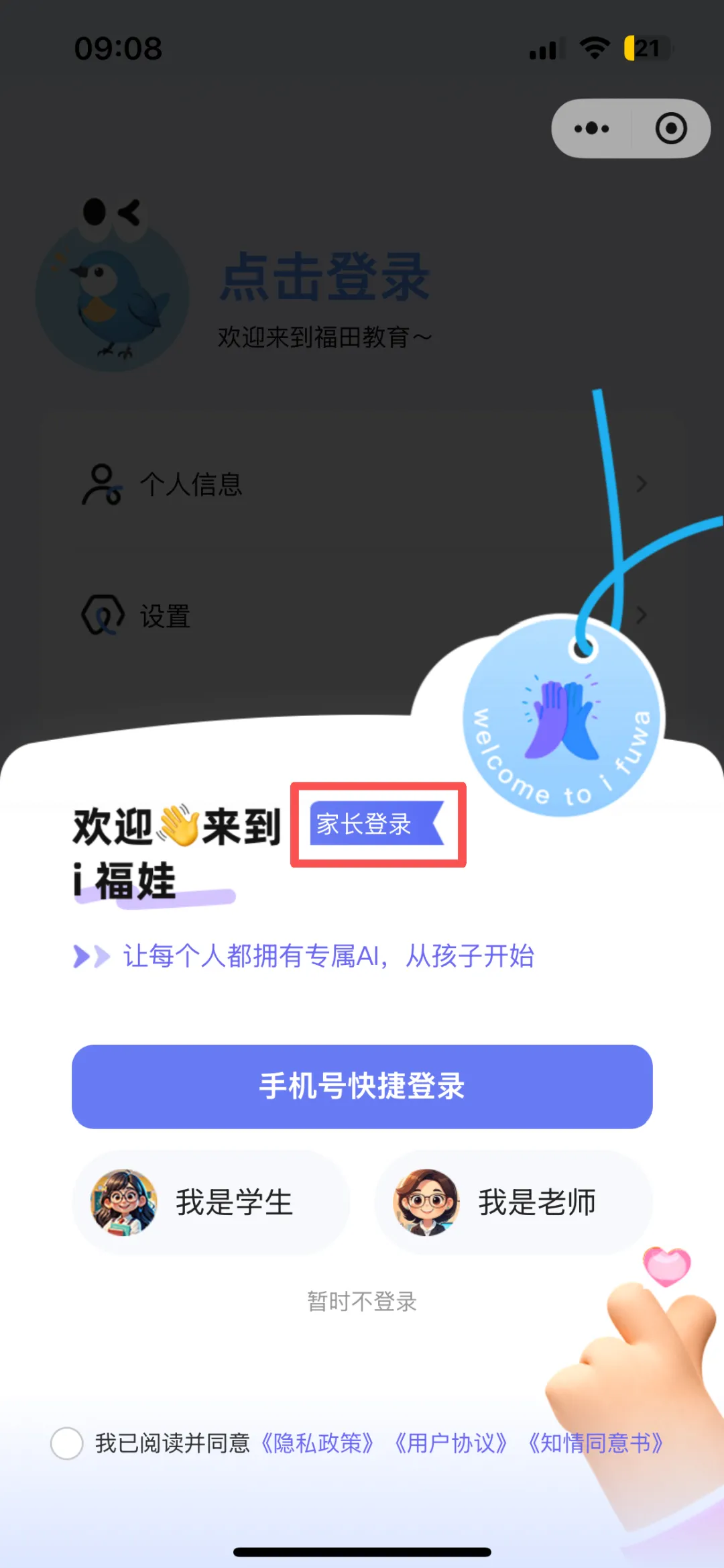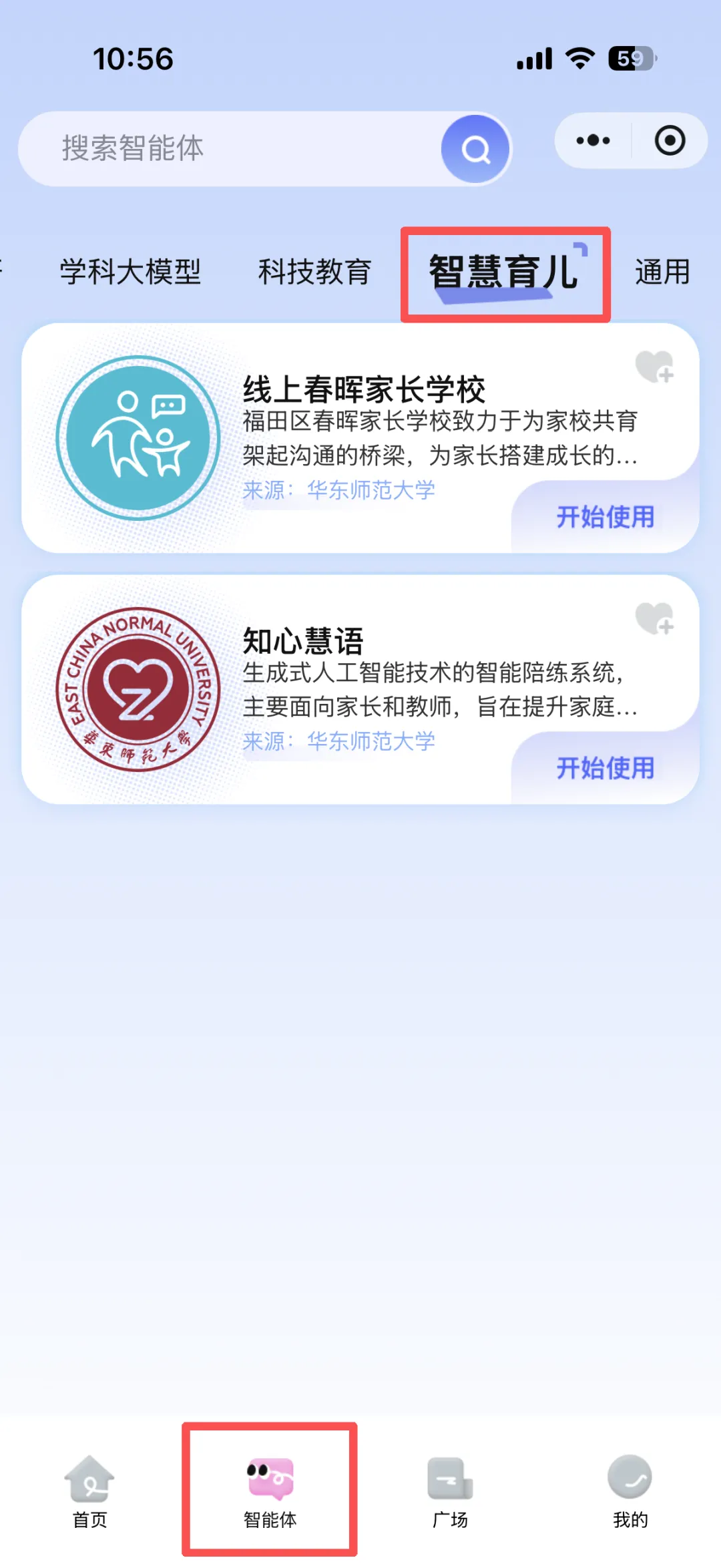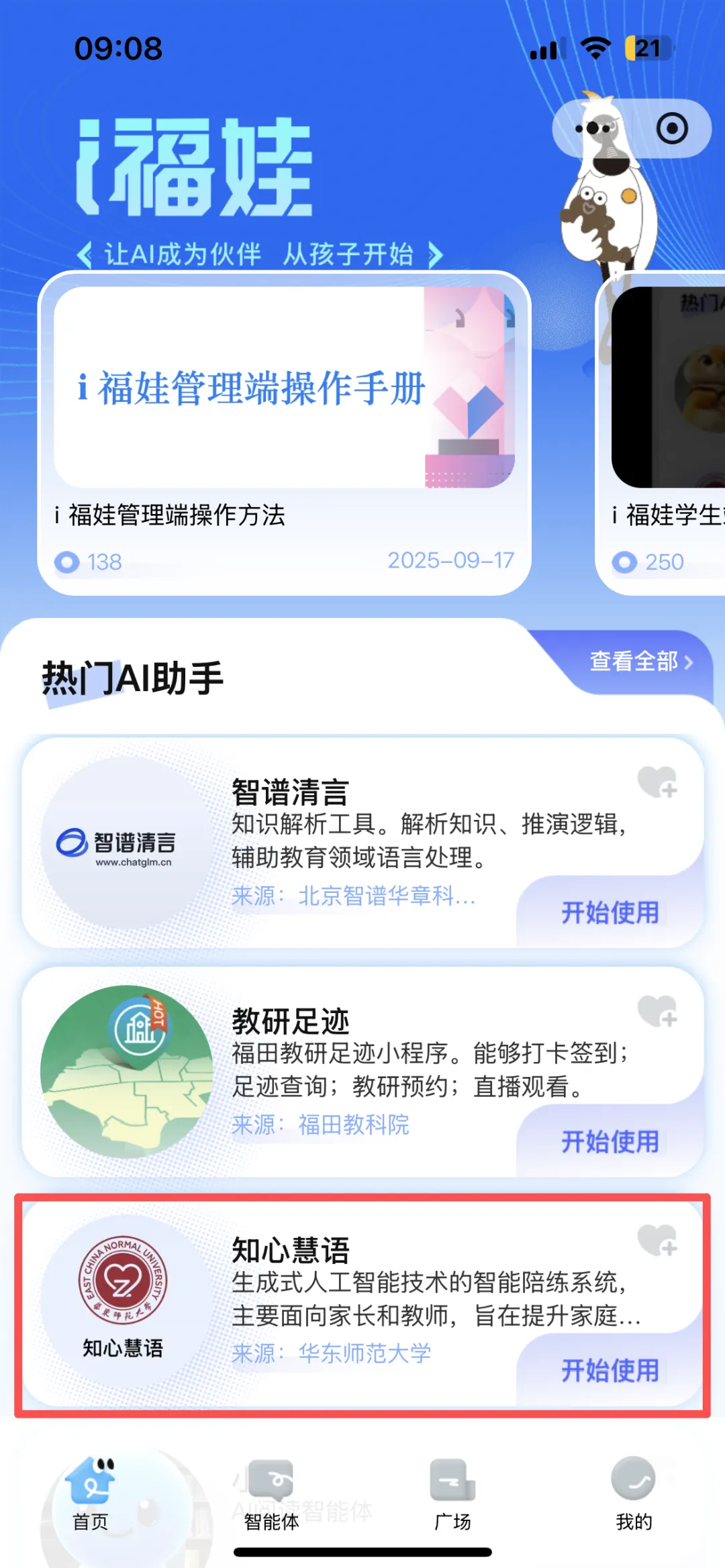 打开“i福娃”小程序,点击“智能体”-“智慧育儿”进入,即可开启学习旅程。