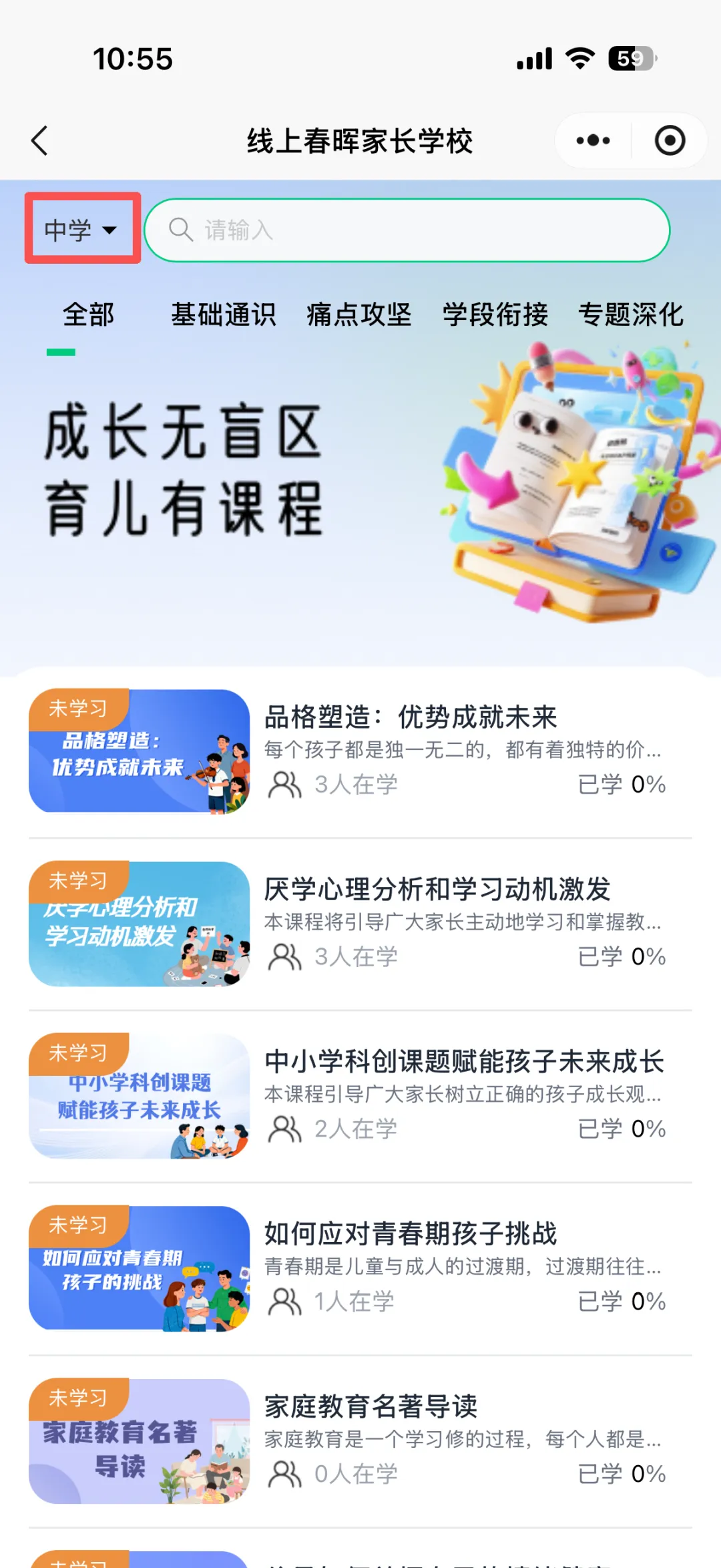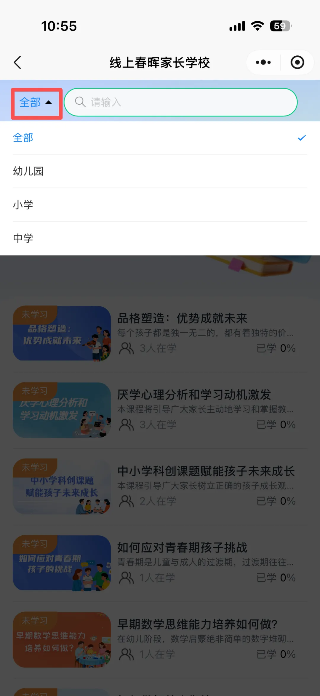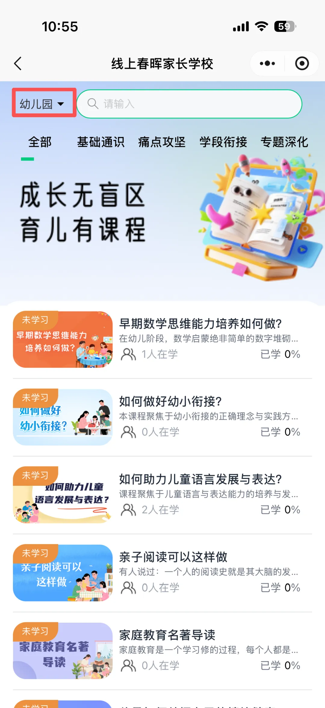 线上春晖家长学校为各位家长提供了幼儿园、小学、中学等各学段专属课程。