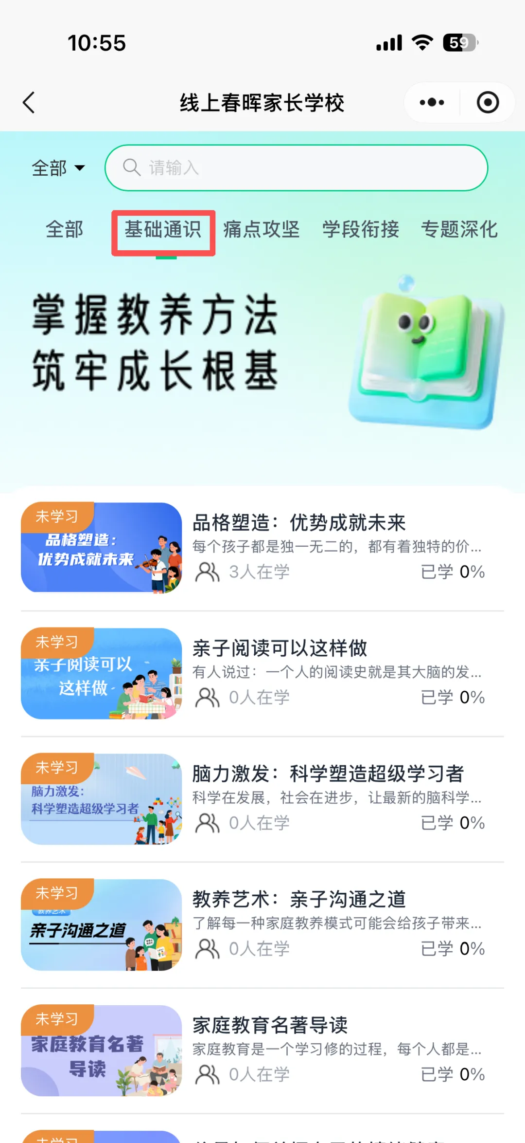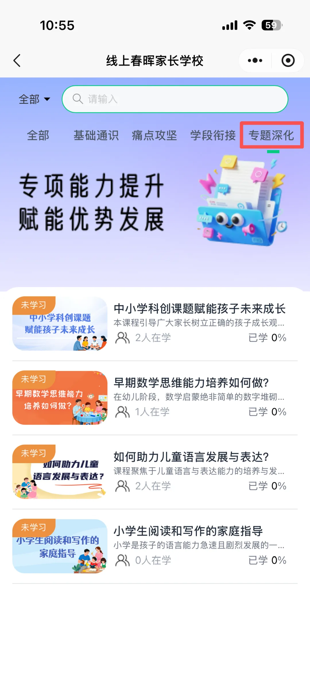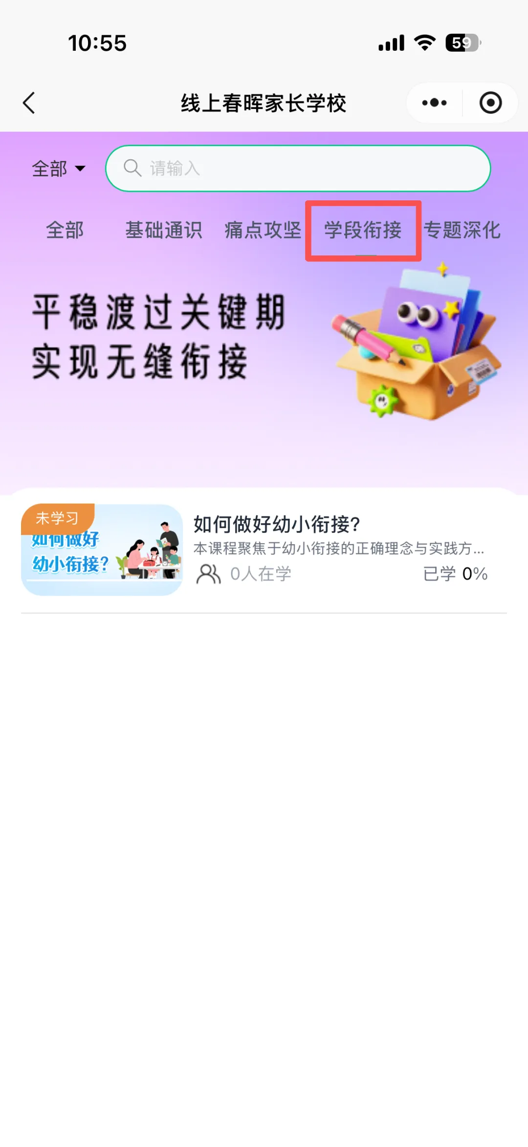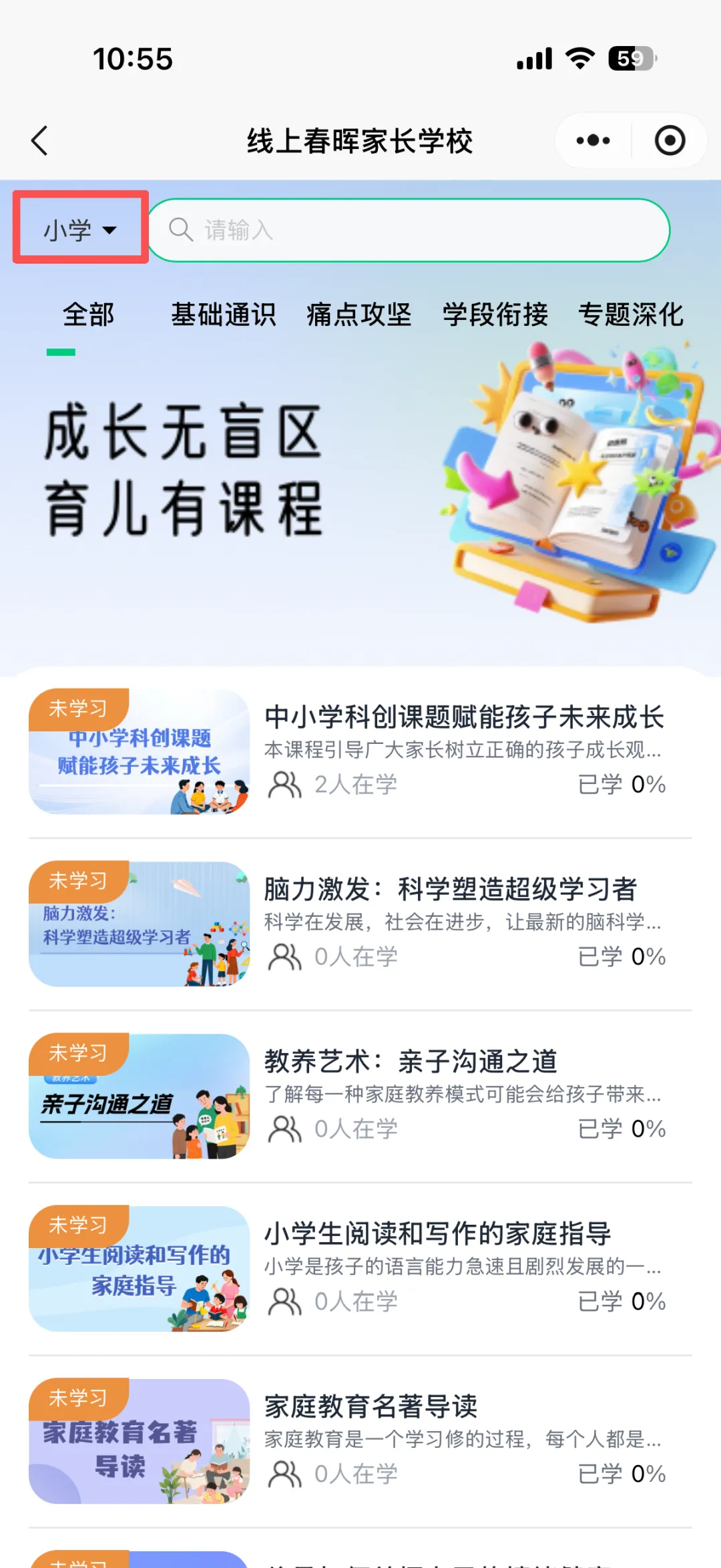 线上春晖家长学校为各位家长提供了幼儿园、小学、中学等各学段专属课程。