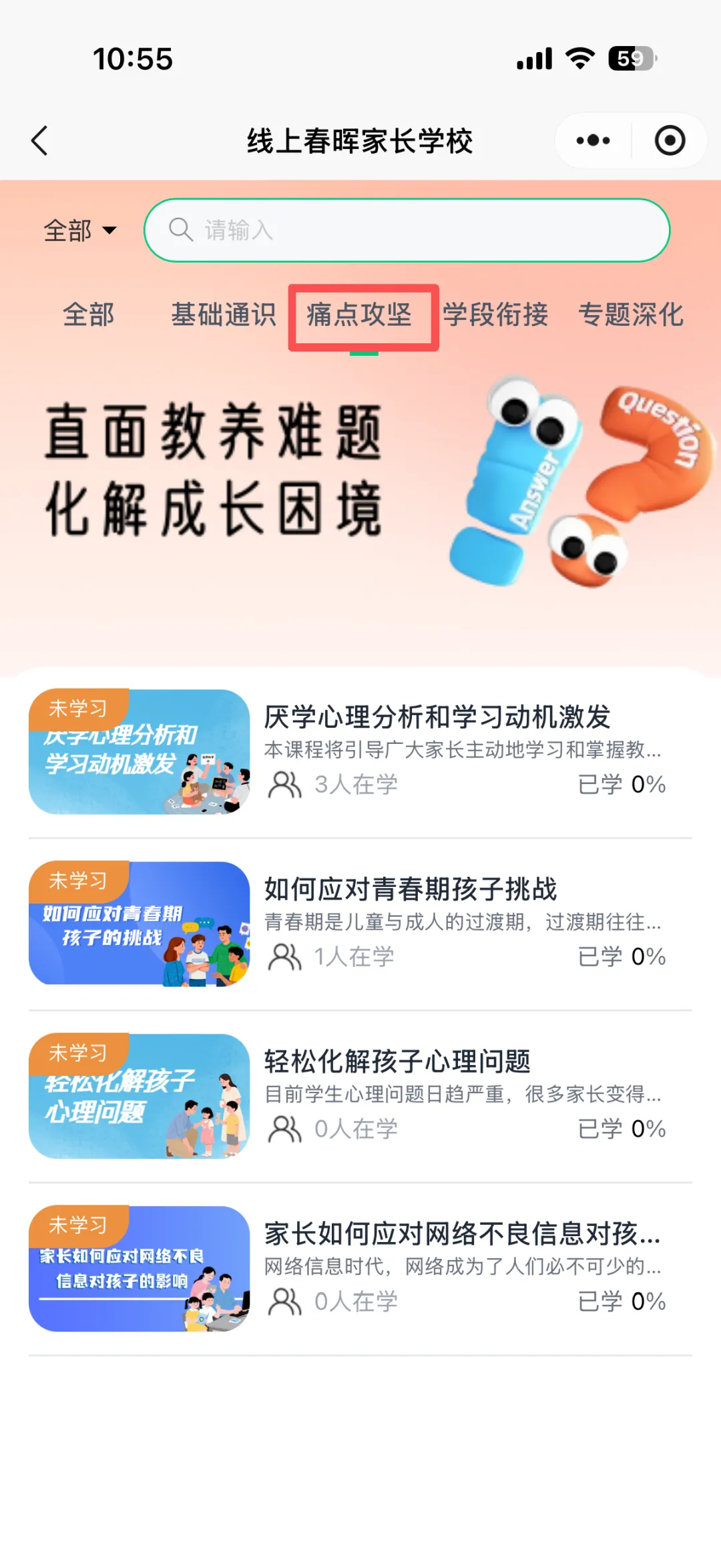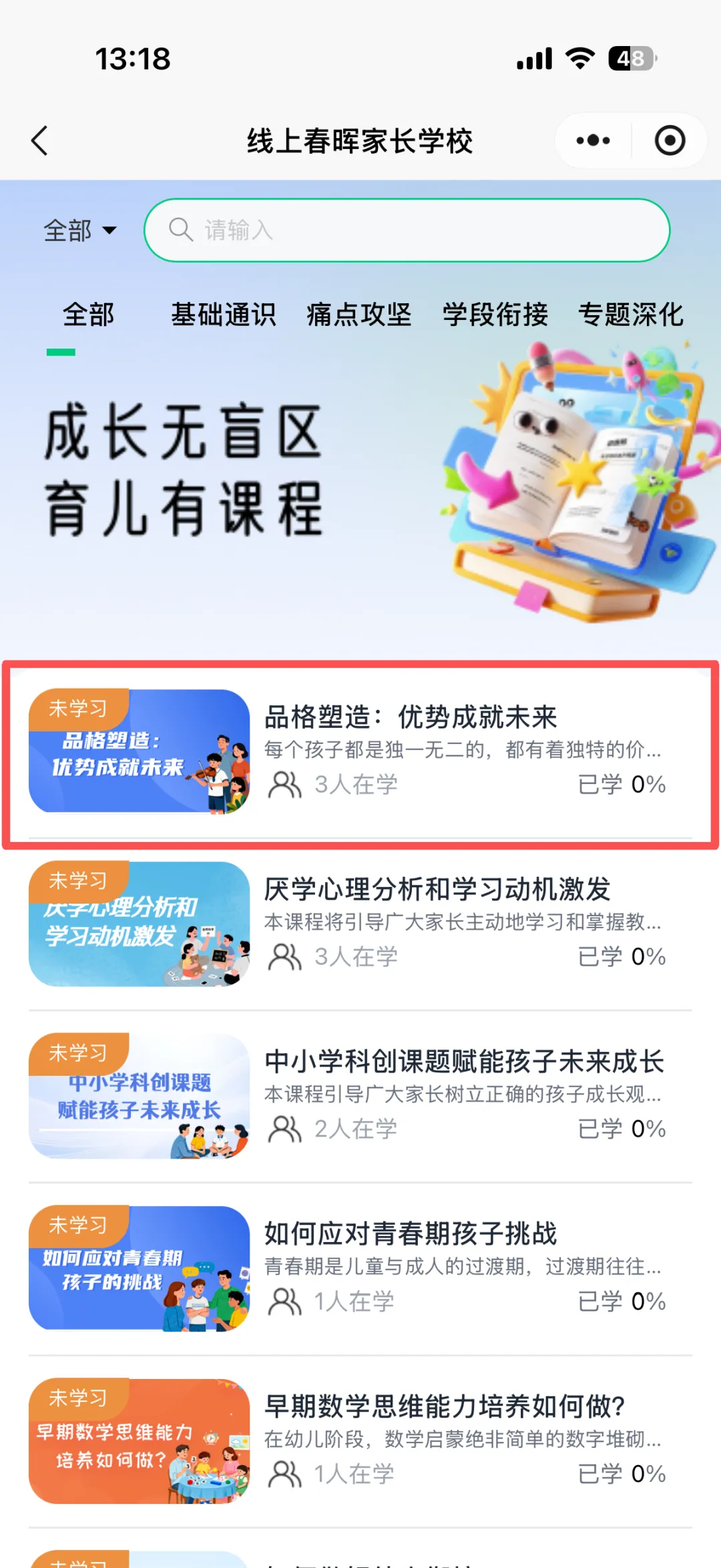 平台打包了24个实用的亲子技能,从幼儿园到高中全学段覆盖。无论是情绪问题、沟通小难题,还是学习助攻、时间管理妙招……都能快速锁定小挑战,开启成长之旅。